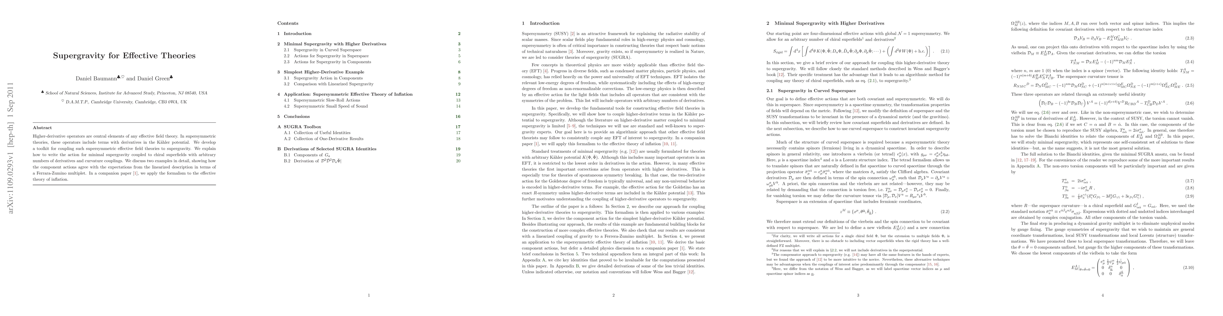 This paper develops a framework for coupling supersymmetric effective field theories with higher-derivative operators to supergravity, presenting a method to write the action for minimal supergravity coupled to chiral superfields. It provides detailed examples demonstrating agreement with linearized descriptions and hints at applications to inflationary effective theories.