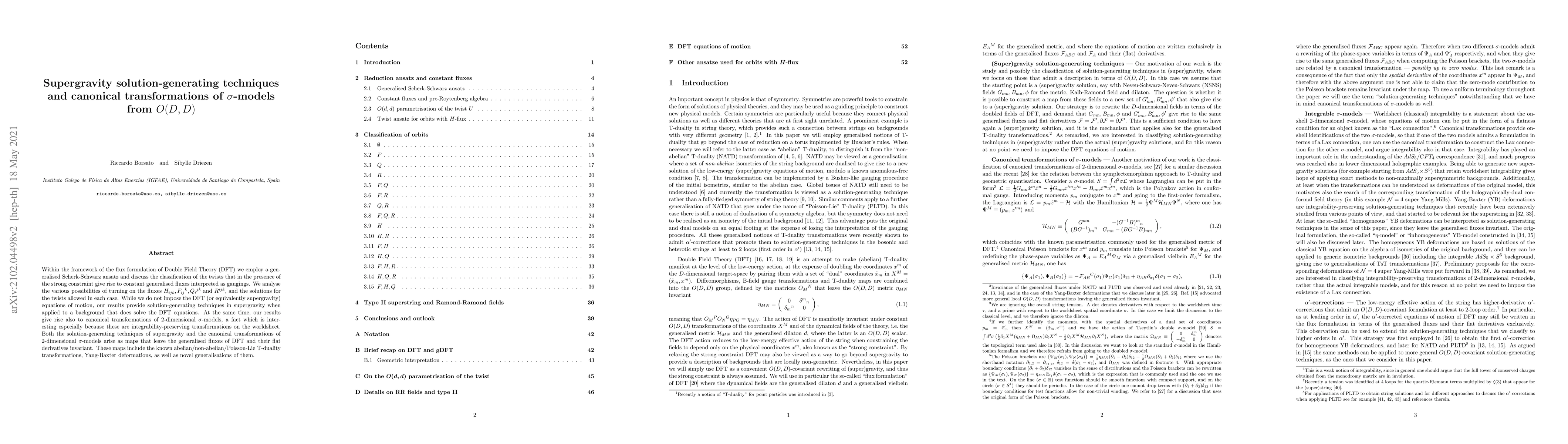 This paper explores supergravity solution-generating techniques and canonical transformations of 2-dimensional $\sigma$-models using the flux formulation of Double Field Theory (DFT). It classifies twists leading to constant generalised fluxes, revealing novel transformations and solution methods for supergravity.