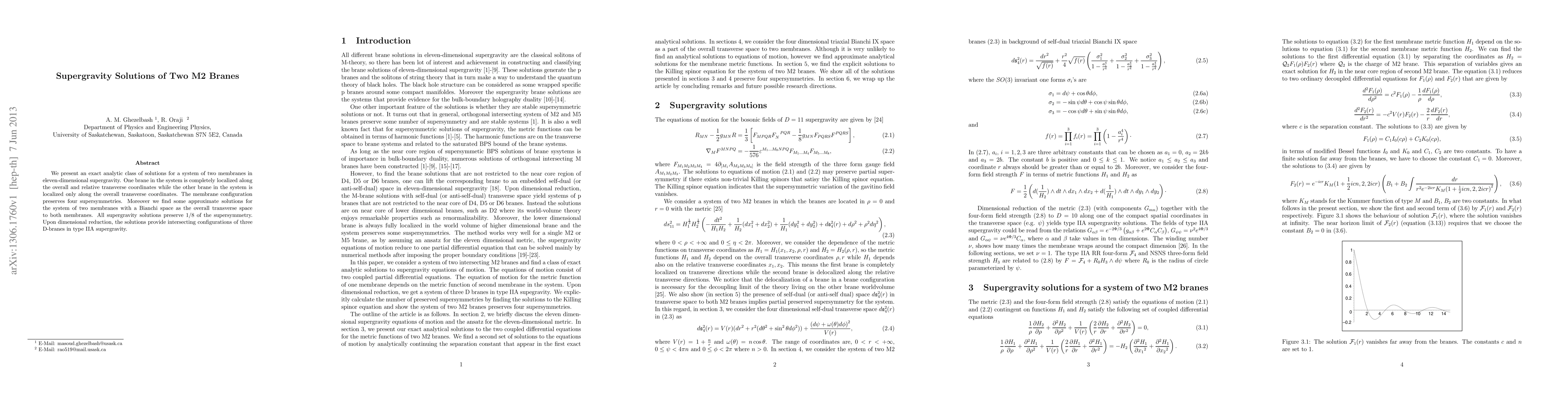 This paper details exact solutions for a system of two M2 branes in eleven-dimensional supergravity, preserving four supersymmetries, with one fully localized brane and the other partially localized. It also explores approximate solutions for configurations with a Bianchi space, maintaining 1/8 supersymmetry upon dimensional reduction, which corresponds to intersecting D-branes in type IIA supergravity.