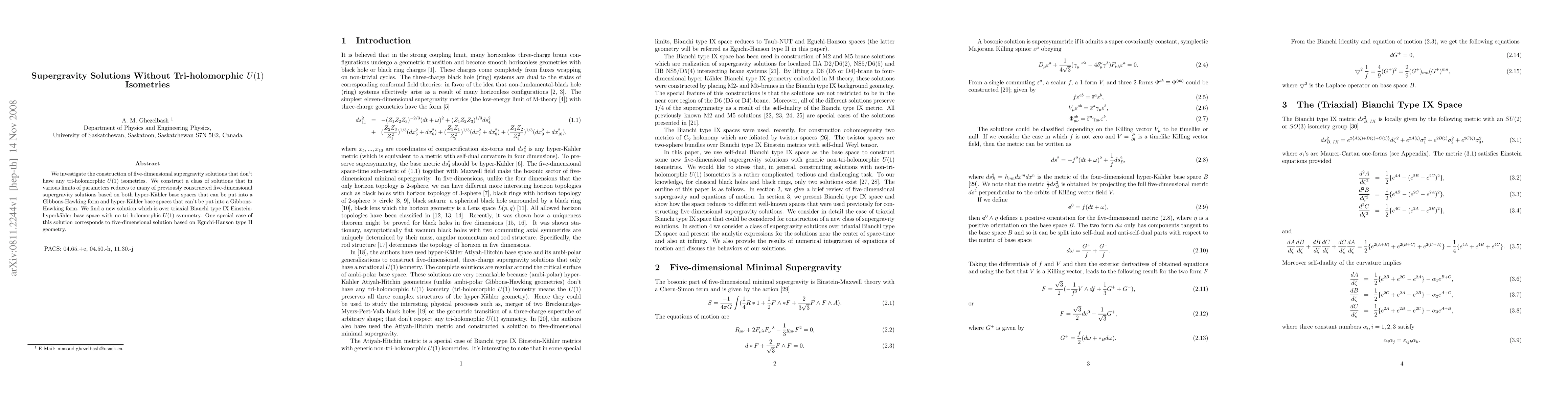 This paper constructs five-dimensional supergravity solutions lacking tri-holomorphic U(1) isometries, presenting a new solution over a triaxial Bianchi type IX Einstein-hyperkaehler base space. The solutions generalize previously constructed models and include a special case based on Eguchi-Hanson type II geometry.