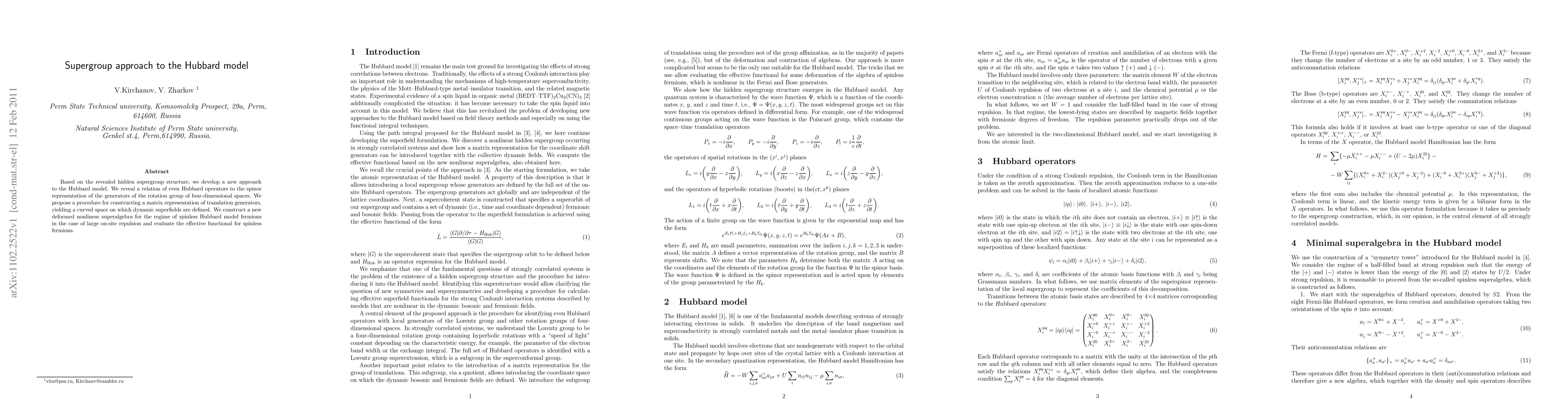 Based on the revealed hidden supergroup structure, we develop a new approach to the Hubbard model. We reveal a relation of even Hubbard operators to the spinor representation of the generators of the rotation group of four-dimensional spaces. We propose a procedure for constructing a matrix representation of translation generators, yielding a curved space on which dynamic superfields are defined. We construct a new deformed nonlinear superalgebra for the regime of spinless Hubbard model fermions in the case of large on-site repulsion and evaluate the effective functional for spinless fermions.
