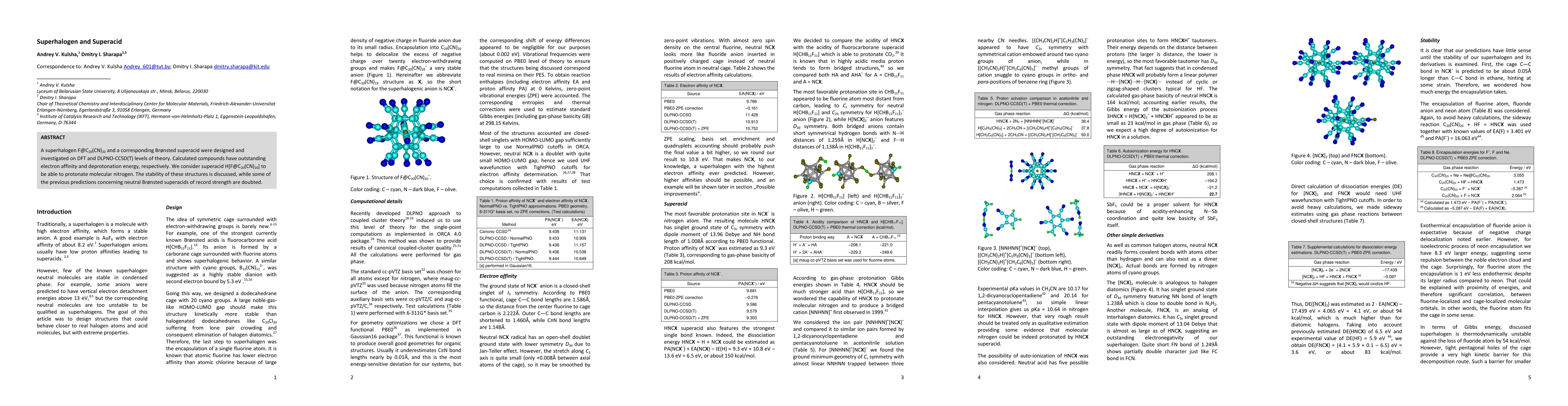 A superhalogen $\rm{F@C_{20}(CN)_{20}}$ and a corresponding Br{\o}nsted superacid were designed and investigated on DFT and DLPNO-CCSD(T) levels of theory. Calculated compounds have outstanding electron affinity and deprotonation energy, respectively. We consider superacid $\rm{H[F@C_{20}(CN)_{20}]}$ to be able to protonate molecular nitrogen. The stability of these structures is discussed, while some of the previous predictions concerning Br{\o}nsted superacids of record strength are doubted.
