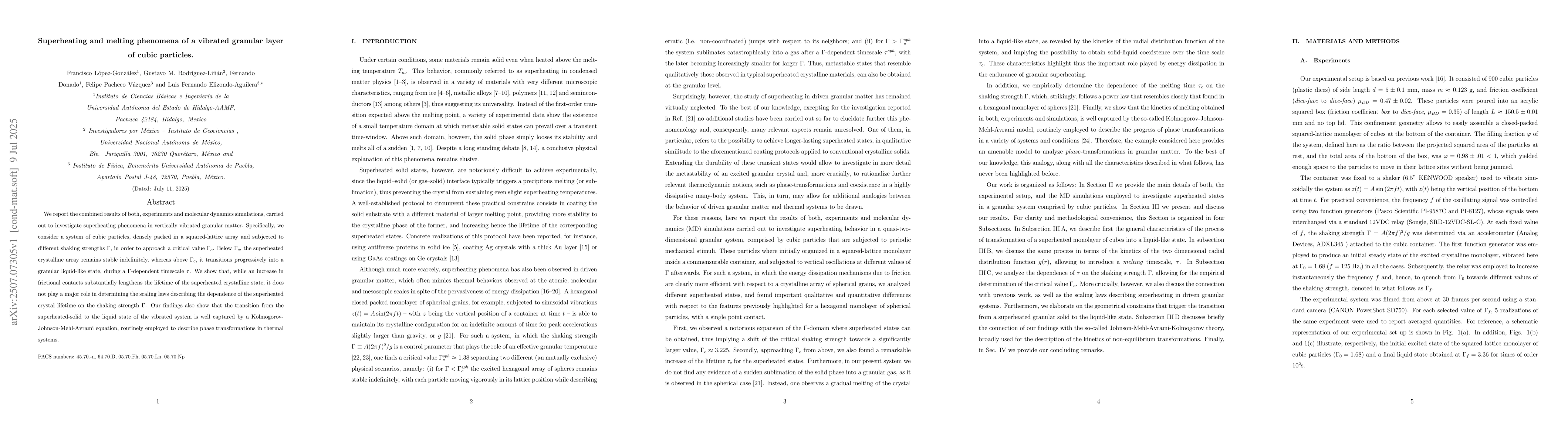 We report the combined results of experiments and molecular dynamics simulations conducted to investigate superheating phenomena in vertically vibrated granular matter. Specifically, we consider a system of cubic particles densely packed in a square-lattice array and subjected to different shaking strengths, denoted by Gamma, approaching a critical value Gamma_c. Below Gamma_c, the superheated crystalline array remains indefinitely stable. Above Gamma_c, it transitions progressively into a granular liquid-like state over a Gamma-dependent timescale tau. We show that while an increase in frictional contacts significantly prolongs the lifetime of the superheated crystalline state, it does not play a major role in the scaling laws governing how that lifetime depends on shaking strength. Our findings also show that the transition from the superheated solid to the liquid state in the vibrated system is well described by a Kolmogorov-Johnson-Mehl-Avrami (KJMA) equation, which is commonly used to model phase transformations in thermal systems.