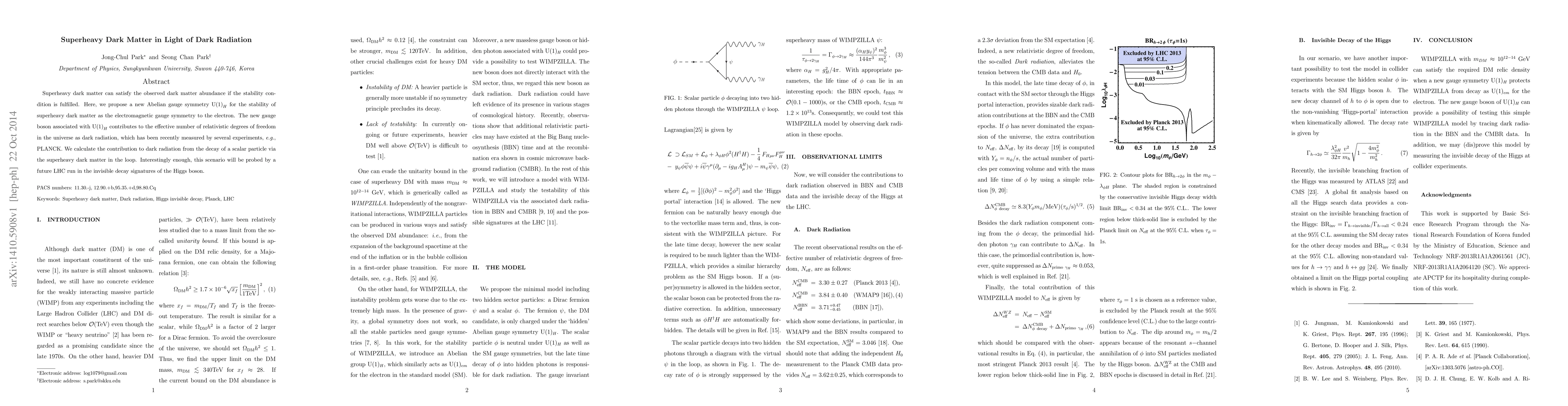 The introduction of a new Abelian gauge symmetry U(1)H to stabilize superheavy dark matter and the calculation of dark radiation contributions from the late-time decay of a scalar particle φ via the WIMPZILLA ψ loop.