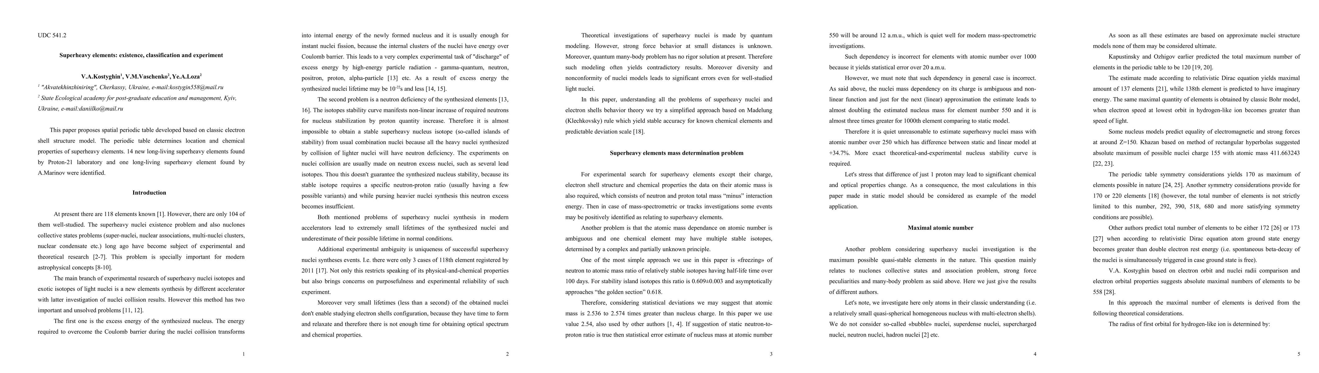 This paper proposes spatial periodic table developed based on classic electron shell structure model. The periodic table determines location and chemical properties of superheavy elements. 14 new long-living superheavy elements found by Proton-21 laboratory and one long-living superheavy element found by A.Marinov were identified.