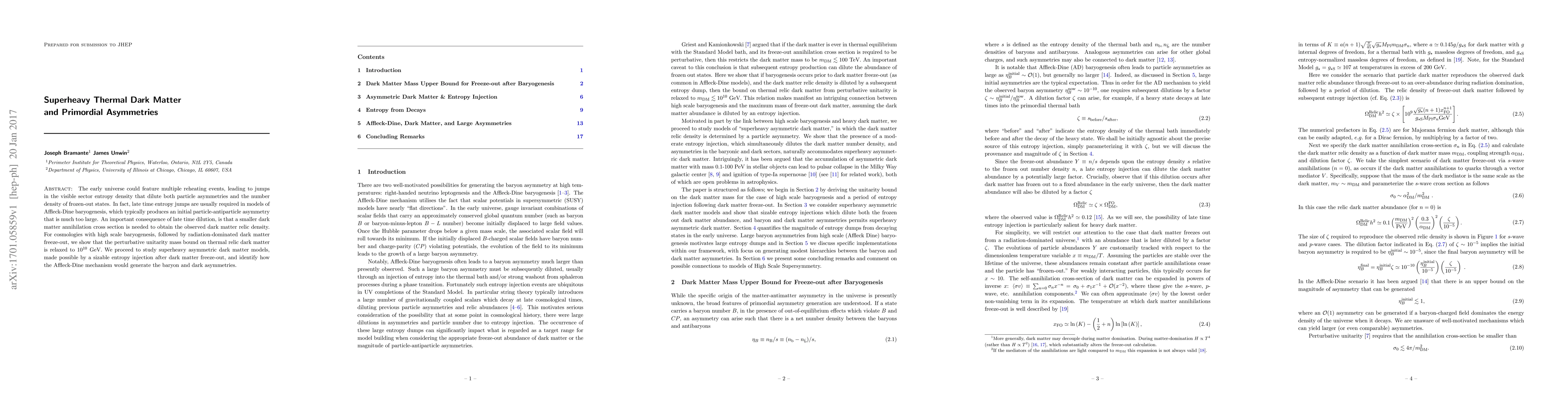 The early universe could feature multiple reheating events, leading to jumps in the visible sector entropy density that dilute both particle asymmetries and the number density of frozen-out states. In fact, late time entropy jumps are usually required in models of Affleck-Dine baryogenesis, which typically produces an initial particle-antiparticle asymmetry that is much too large. An important consequence of late time dilution, is that a smaller dark matter annihilation cross section is needed to obtain the observed dark matter relic density. For cosmologies with high scale baryogenesis, followed by radiation-dominated dark matter freeze-out, we show that the perturbative unitarity mass bound on thermal relic dark matter is relaxed to $10^{10}$ GeV. We proceed to study superheavy asymmetric dark matter models, made possible by a sizable entropy injection after dark matter freeze-out, and identify how the Affleck-Dine mechanism would generate the baryon and dark asymmetries.