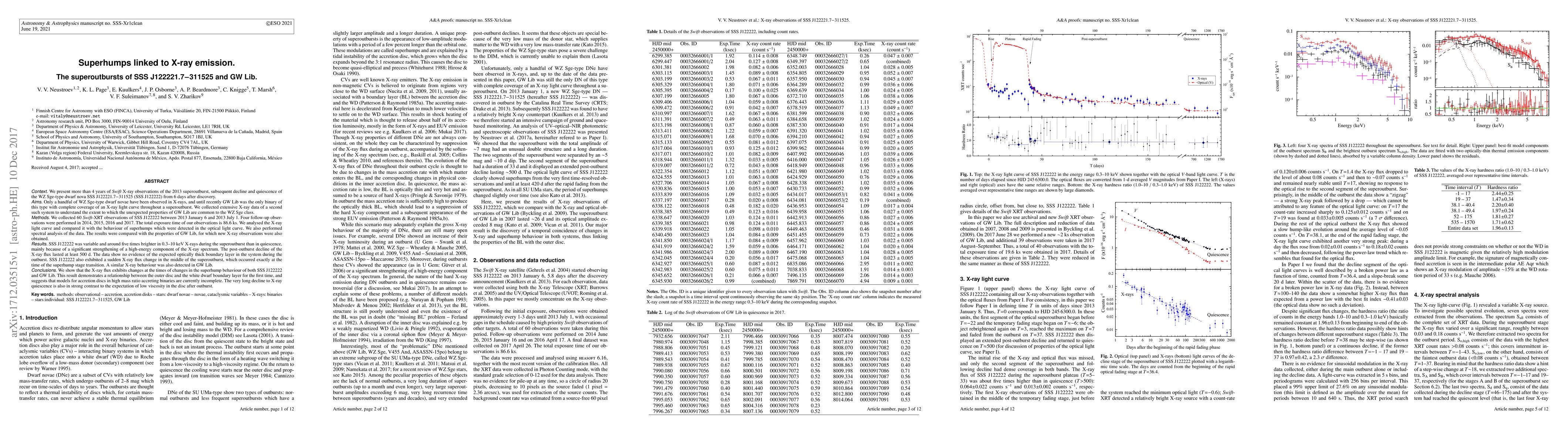 [Abridged] We present more than 4 years of Swift X-ray observations of the 2013 superoutburst, subsequent decline and quiescence of the WZ Sge-type dwarf nova SSS J122221.7-311525 (SSS122222) from 6 days after discovery. Only a handful of WZ Sge-type dwarf novae have been observed in X-rays, and until recently GW Lib was the only binary of this type with complete coverage of an X-ray light curve throughout a superoutburst. We collected extensive X-ray data of a second such system to understand the extent to which the unexpected properties of GW Lib are common to the WZ Sge class. We analysed the X-ray light curve and compared it with the behaviour of superhumps which were detected in the optical light curve. We also performed spectral analysis of the data. The results were compared with the properties of GW Lib, for which new X-ray observations were also obtained. SSS122222 was variable and around five times brighter in 0.3-10 keV X-rays during the superoutburst than in quiescence, mainly because of a significant strengthening of a high-energy component of the X-ray spectrum. The post-outburst decline of the X-ray flux lasted at least 500 d. The data show no evidence of the expected optically thick boundary layer in the system during the outburst. SSS122222 also exhibited a sudden X-ray flux change in the middle of the superoutburst, which occurred exactly at the time of the superhump stage transition. A similar X-ray behaviour was also detected in GW Lib. This result demonstrates a relationship between the outer disc and the white dwarf boundary layer for the first time, and suggests that models for accretion discs in high mass ratio accreting binaries are currently incomplete. The very long decline to X-ray quiescence is also in strong contrast to the expectation of low viscosity in the disc after outburst.