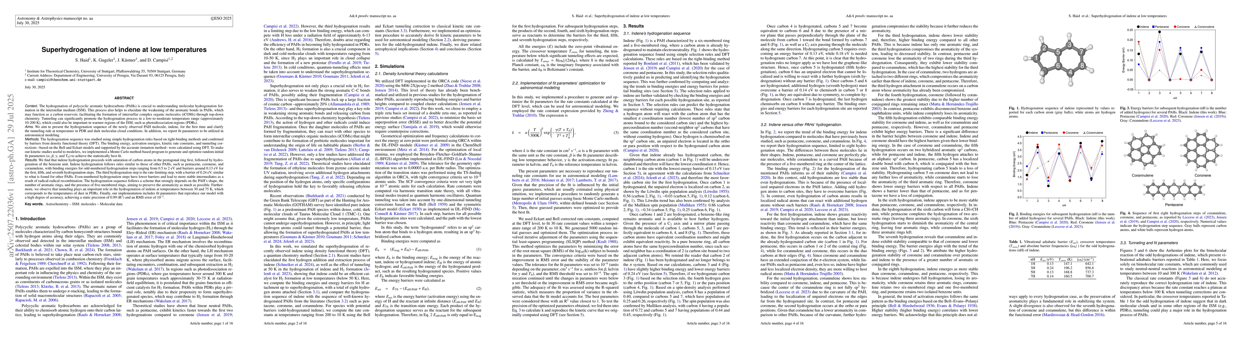 The study investigates the hydrogenation sequence of indene, a polycyclic aromatic hydrocarbon (PAH), at low temperatures using density functional theory (DFT) calculations and a Monte Carlo method for fitting parameters. The hydrogenation rules and barriers are compared to other PAHs like pentacene, coronene, and corannulene.