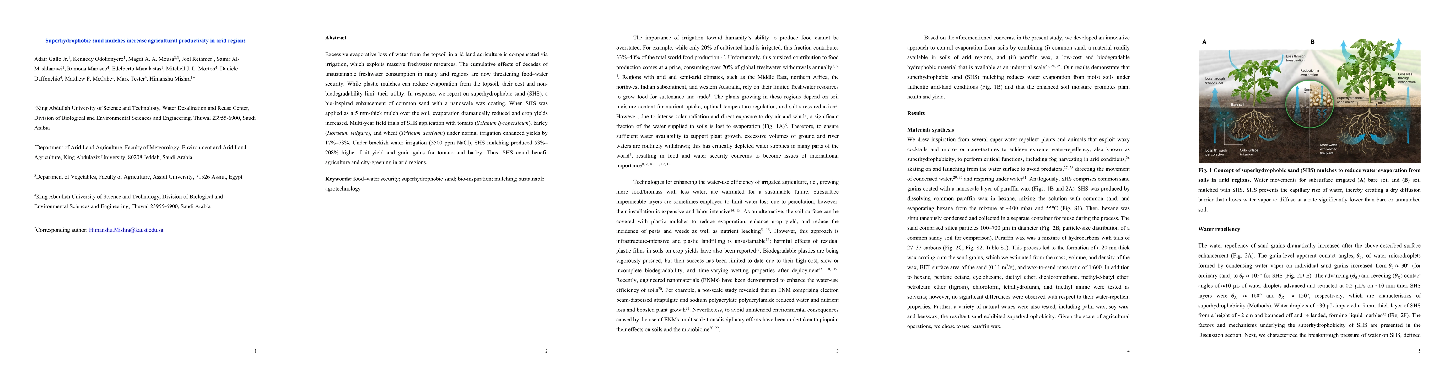This research introduces superhydrophobic sand (SHS), a cost-effective, biodegradable mulch that significantly reduces evaporation from arid soils. Field trials showed SHS increased crop yields by 17%-73% under normal irrigation and 53%-208% under brackish water irrigation, offering a sustainable solution for arid agriculture and urban greening.