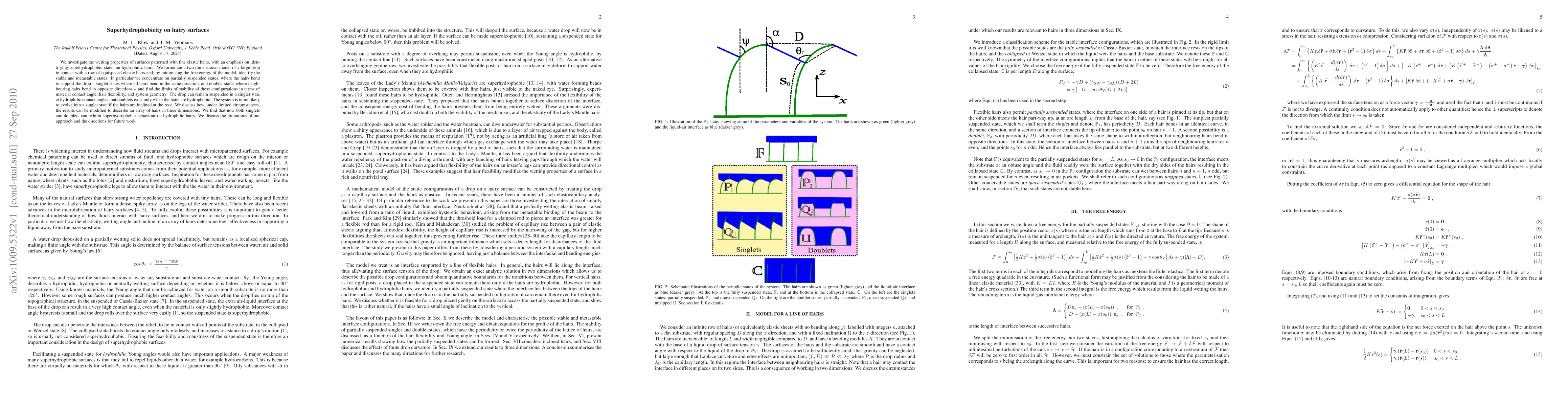 We investigate the wetting properties of surfaces patterned with fine elastic hairs, with an emphasis on identifying superhydrophobic states on hydrophilic hairs. We formulate a two dimensional model of a large drop in contact with a row of equispaced elastic hairs and, by minimising the free energy of the model, identify the stable and metastable states. In particular we concentrate on "partially suspended" states, where the hairs bend to support the drop -- singlet states where all hairs bend in the same direction, and doublet states where neighbouring hairs bend in opposite directions -- and find the limits of stability of these configurations in terms of material contact angle, hair flexibility, and system geometry. The drop can remain suspended in a singlet state at hydrophilic contact angles, but doublets exist only when the hairs are hydrophobic. The system is more likely to evolve into a singlet state if the hairs are inclined at the root. We discuss how, under limited circumstances, the results can be modified to describe an array of hairs in three dimensions. We find that now both singlets and doublets can exhibit superhydrophobic behaviour on hydrophilic hairs. We discuss the limitations of our approach and the directions for future work.