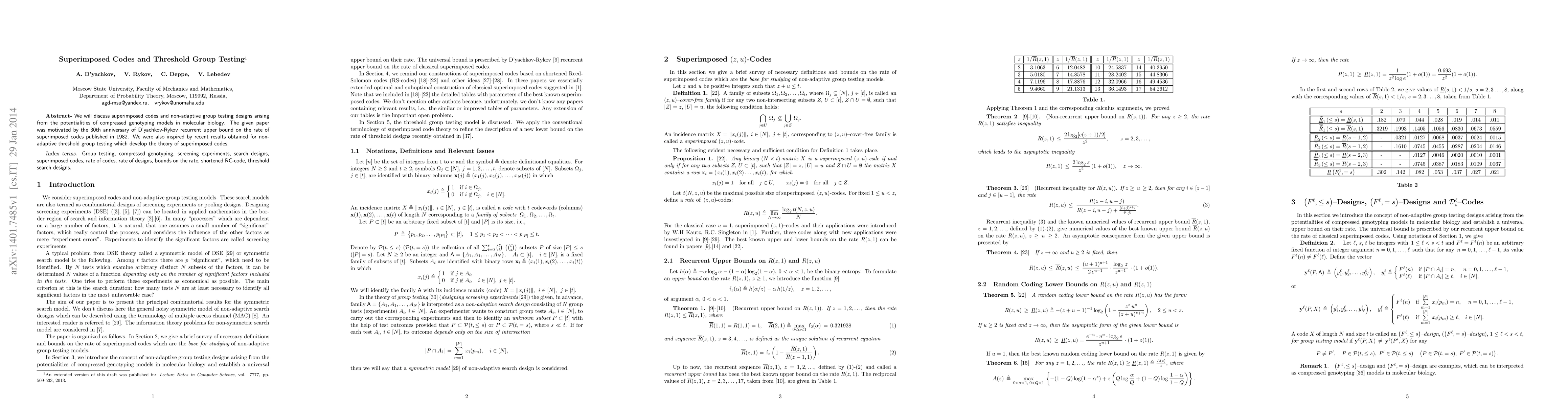 The research explores superimposed codes and non-adaptive group testing designs, drawing from compressed genotyping models in molecular biology, inspired by D'yachkov-Rykov's 1982 upper bound on superimposed codes' rate.
