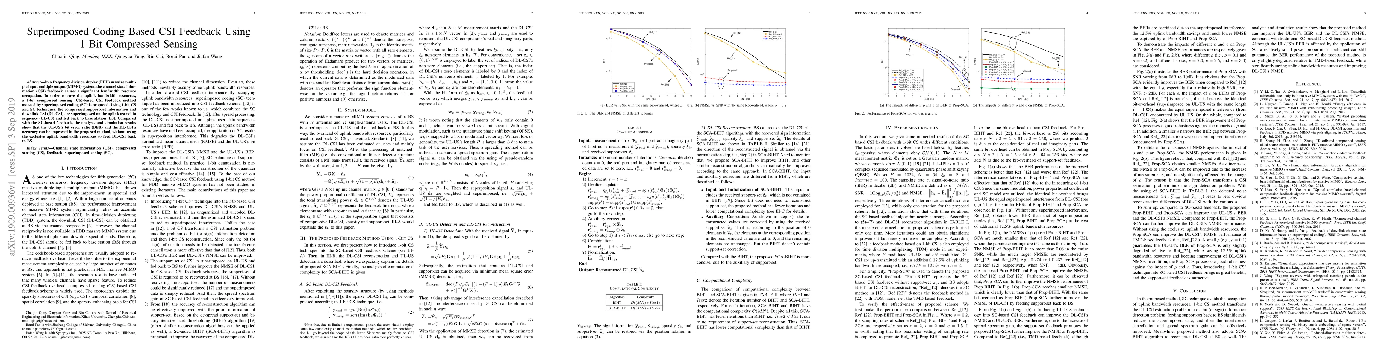 In a frequency division duplex (FDD) massive multiple input multiple output (MIMO) system, the channel state information (CSI) feedback causes a significant bandwidth resource occupation. In order to save the uplink bandwidth resources, a 1-bit compressed sensing (CS)-based CSI feedback method assisted by superimposed coding (SC) is proposed. Using 1-bit CS and SC techniques, the compressed support-set information and downlink CSI (DL-CSI) are superimposed on the uplink user data sequence (UL-US) and fed back to base station (BS). Compared with the SC-based feedback, the analysis and simulation results show that the UL-US's bit error ratio (BER) and the DL-CSI's accuracy can be improved in the proposed method, without using the exclusive uplink bandwidth resources to feed DL-CSI back to BS.