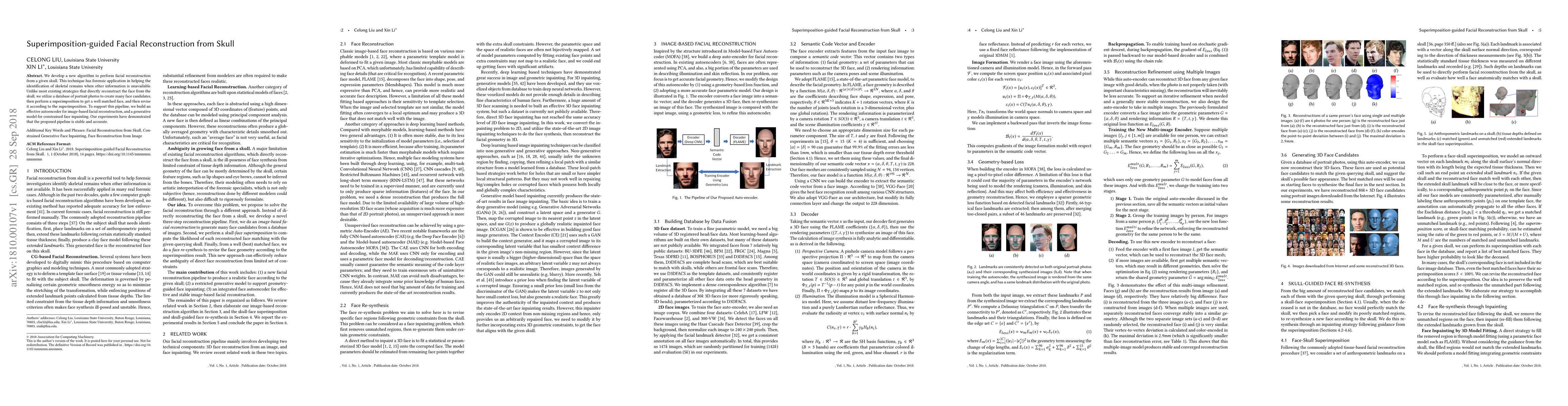 We develop a new algorithm to perform facial reconstruction from a given skull. This technique has forensic application in helping the identification of skeletal remains when other information is unavailable. Unlike most existing strategies that directly reconstruct the face from the skull, we utilize a database of portrait photos to create many face candidates, then perform a superimposition to get a well matched face, and then revise it according to the superimposition. To support this pipeline, we build an effective autoencoder for image-based facial reconstruction, and a generative model for constrained face inpainting. Our experiments have demonstrated that the proposed pipeline is stable and accurate.