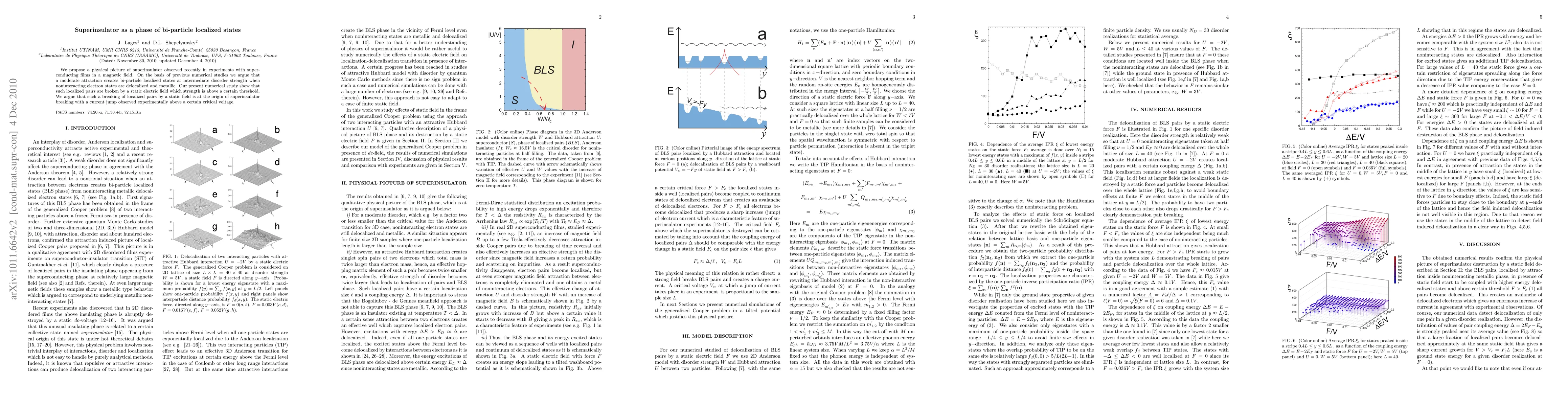We propose a physical picture of superinsulator observed recently in experiments with superconducting films in a magnetic field. On the basis of previous numerical studies we argue that a moderate attraction creates bi-particle localized states at intermediate disorder strength when noninteracting electron states are delocalized and metallic. Our present numerical study show that such localized pairs are broken by a static electric field which strength is above a certain threshold. We argue that such a breaking of localized pairs by a static field is at the origin of superinsulator breaking with a current jump observed experimentally above a certain critical voltage.