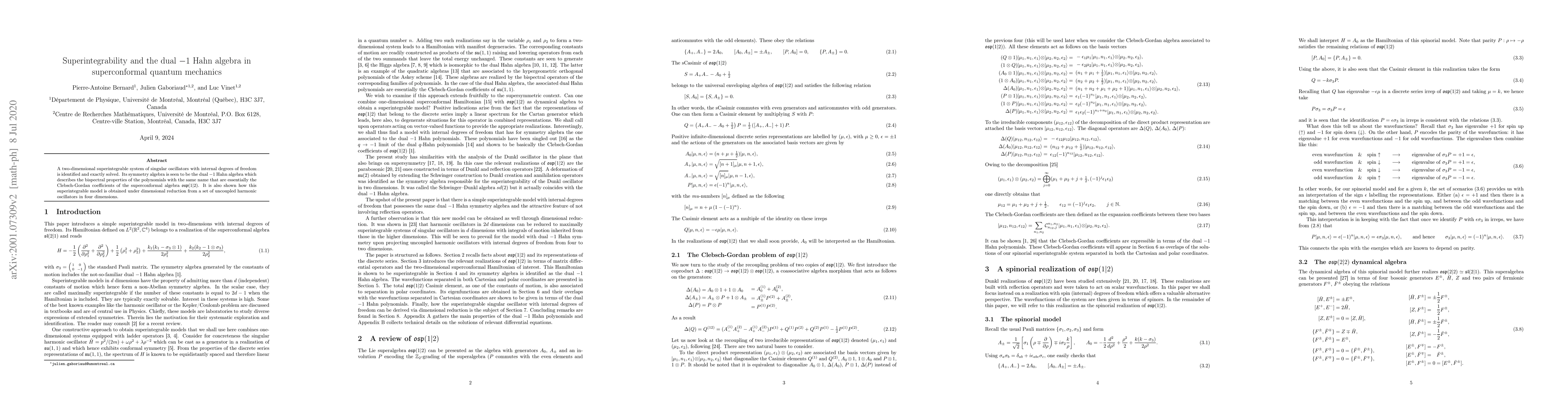 This paper identifies and solves a two-dimensional superintegrable system based on singular oscillators, revealing its symmetry algebra as the dual $-1$ Hahn algebra, which connects to the Clebsch-Gordan coefficients of the $\mathfrak{osp}(1|2)$ superconformal algebra. The model is derived via dimensional reduction from four-dimensional uncoupled harmonic oscillators.