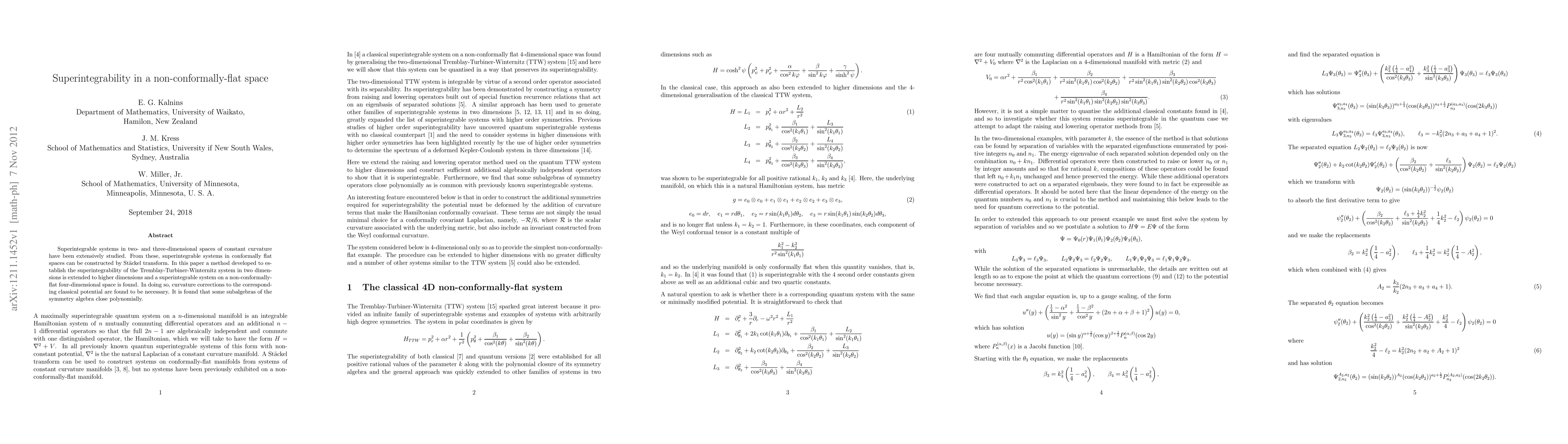 The research extends a method to establish superintegrability of the Tremblay-Turbiner-Winternitz (TTW) system in two dimensions to higher dimensions, finding a superintegrable system on a non-conformally-flat four-dimensional space with curvature corrections to the classical potential.