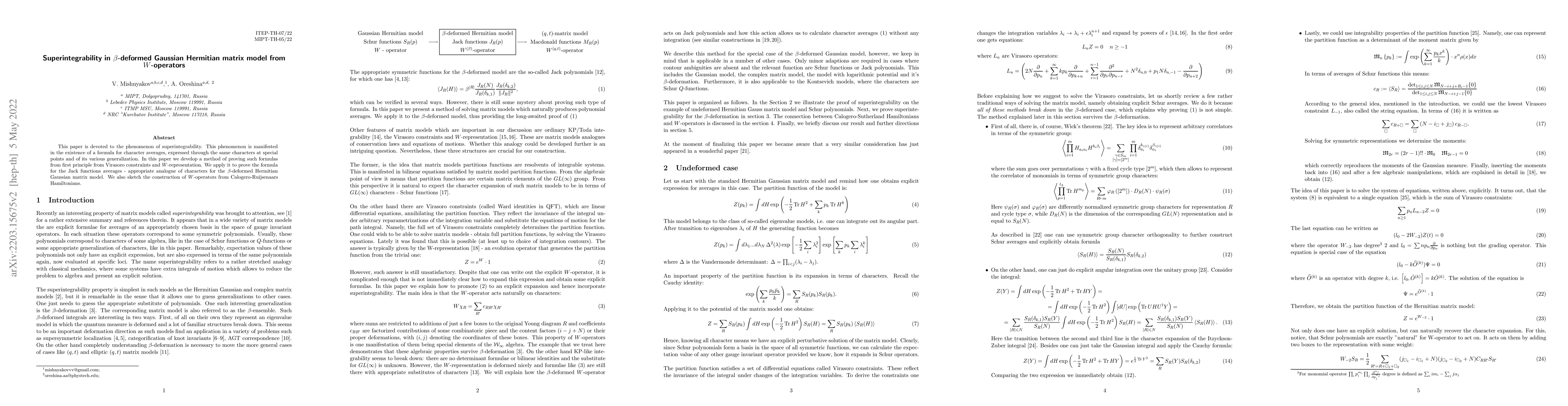 This paper explores superintegrability in the $\beta$-deformed Gaussian Hermitian matrix model, demonstrating how to derive formulas for character averages using Virasoro constraints and $W$-representations. It applies these methods to establish formulas for Jack functions averages and outlines the construction of $W$-operators from Calogero-Ruijsenaars Hamiltonians.