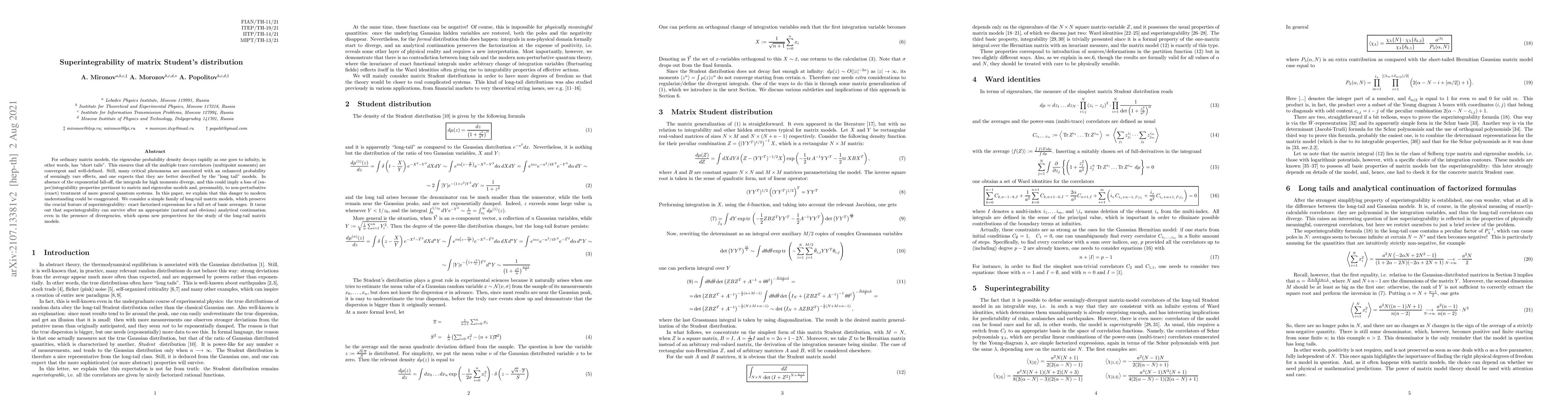 This paper investigates the superintegrability of matrix models with "long tail" distributions, demonstrating that despite the divergence of high moments, superintegrability properties can be preserved through analytical continuation, thus maintaining exact treatment of quantum systems.