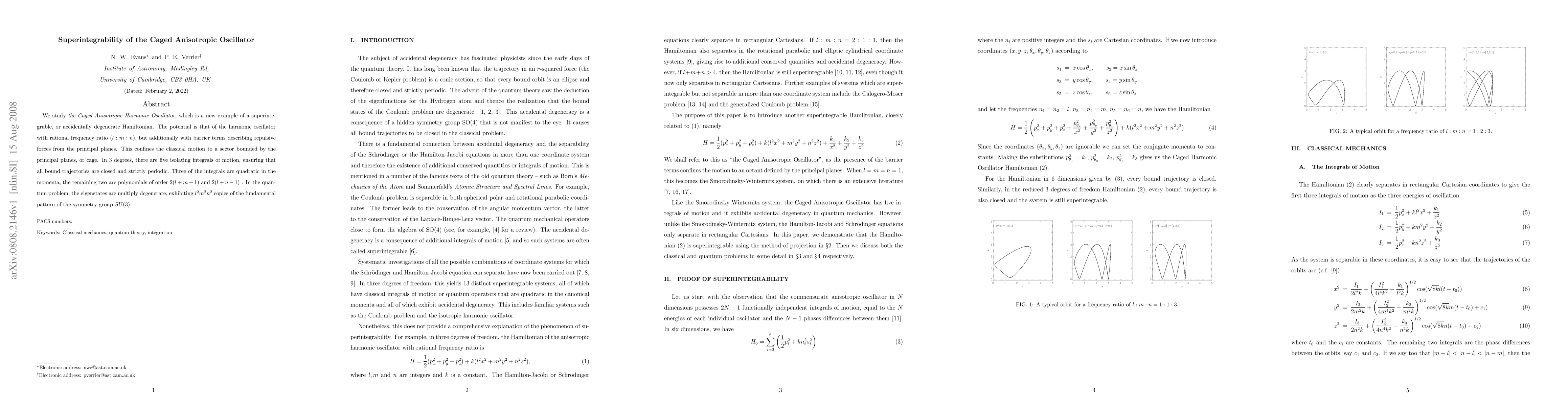 Researchers study a new type of superintegrable system called the Caged Anisotropic Harmonic Oscillator, which has 5 integrals of motion ensuring periodic orbits in 3 dimensions. The quantum version exhibits multiple degenerate eigenstates with patterns similar to the SU(3) symmetry group.