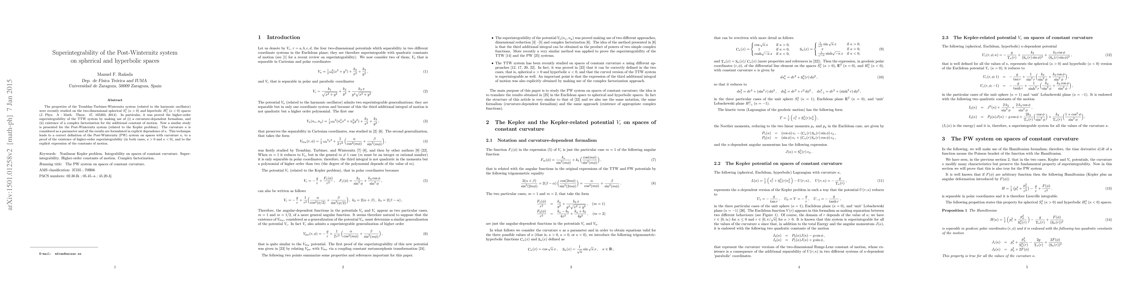 The properties of the Tremblay-Turbiner-Winternitz system (related to the harmonic oscillator) were recently studied on the two-dimensional spherical $S_{\kappa}^2$ ($\kappa>0$) and hiperbolic $H_{\kappa}^2$ ($\kappa<0$) spaces (J. Phys. A : Math. Theor. 47, 165203, 2014). In particular, it was proved the higher-order superintegrability of the TTW system by making use of (i) a curvature-dependent formalism, and (ii) existence of a complex factorization for the additional constant of motion. Now a similar study is presented for the Post-Winternitz system (related to the Kepler problem). The curvature $\kappa$ is considered as a parameter and all the results are formulated in explicit dependence of $\kappa$. This technique leads to a correct definition of the Post-Winternitz (PW) system on spaces with curvature $\kappa$, to a proof of the existence of higher-order superintegrability (in both cases, $\kappa>0$ and $\kappa<0$), and to the explicit expression of the constants of motion.