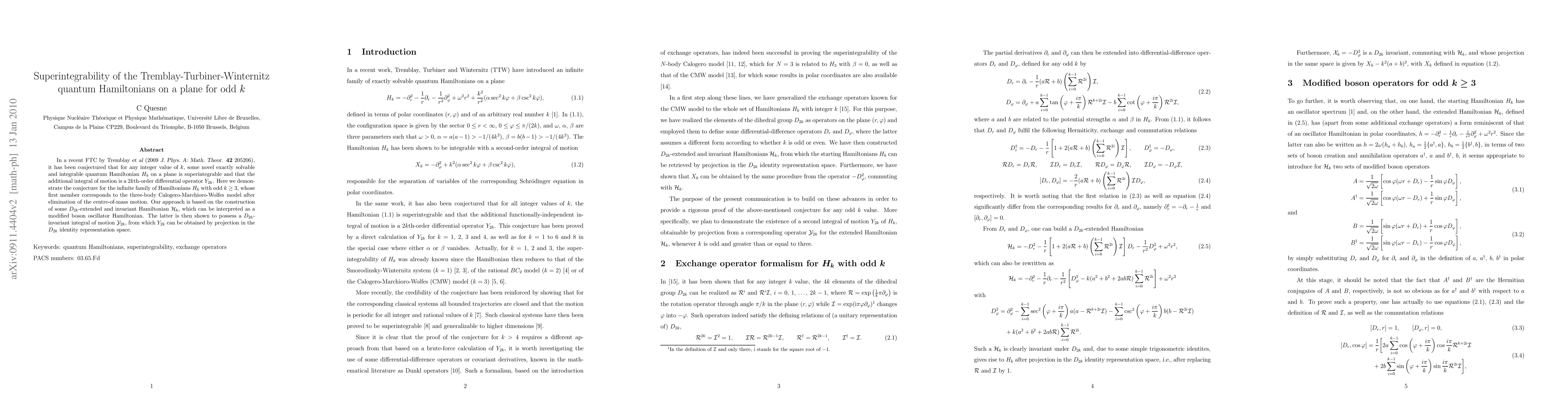 In a recent FTC by Tremblay {\sl et al} (2009 {\sl J. Phys. A: Math. Theor.} {\bf 42} 205206), it has been conjectured that for any integer value of $k$, some novel exactly solvable and integrable quantum Hamiltonian $H_k$ on a plane is superintegrable and that the additional integral of motion is a $2k$th-order differential operator $Y_{2k}$. Here we demonstrate the conjecture for the infinite family of Hamiltonians $H_k$ with odd $k \ge 3$, whose first member corresponds to the three-body Calogero-Marchioro-Wolfes model after elimination of the centre-of-mass motion. Our approach is based on the construction of some $D_{2k}$-extended and invariant Hamiltonian $\chh_k$, which can be interpreted as a modified boson oscillator Hamiltonian. The latter is then shown to possess a $D_{2k}$-invariant integral of motion $\cyy_{2k}$, from which $Y_{2k}$ can be obtained by projection in the $D_{2k}$ identity representation space.