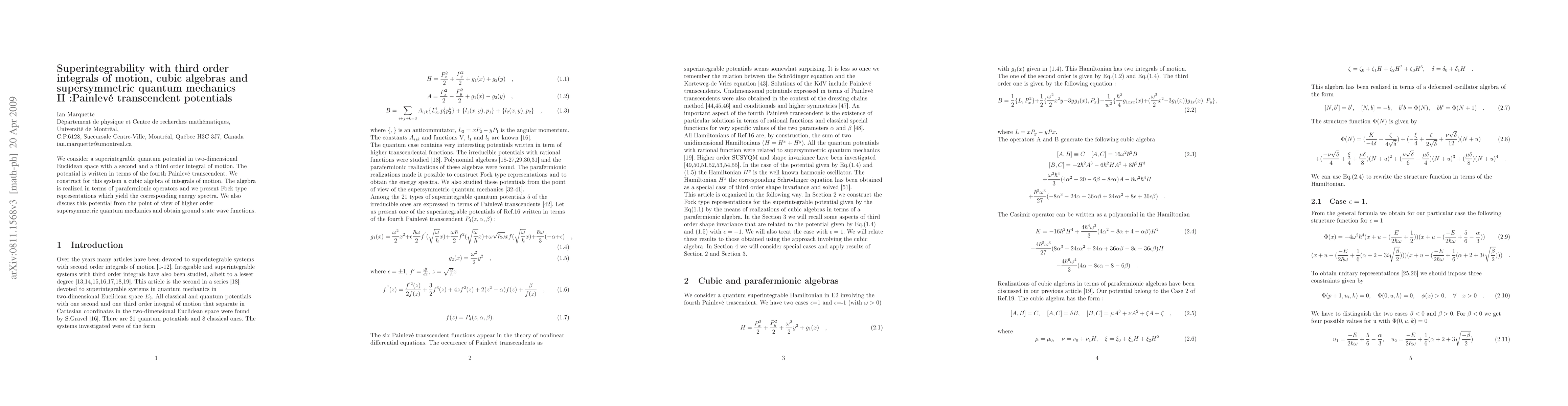 This paper explores superintegrable quantum systems in two-dimensional space featuring a second and third order integral of motion, represented by the fourth Painleve transcendent potential. It constructs a cubic algebra of integrals realized via parafermionic operators, providing Fock representations and corresponding energy spectra, and connects the system to higher order supersymmetric quantum mechanics to derive ground state wave functions.