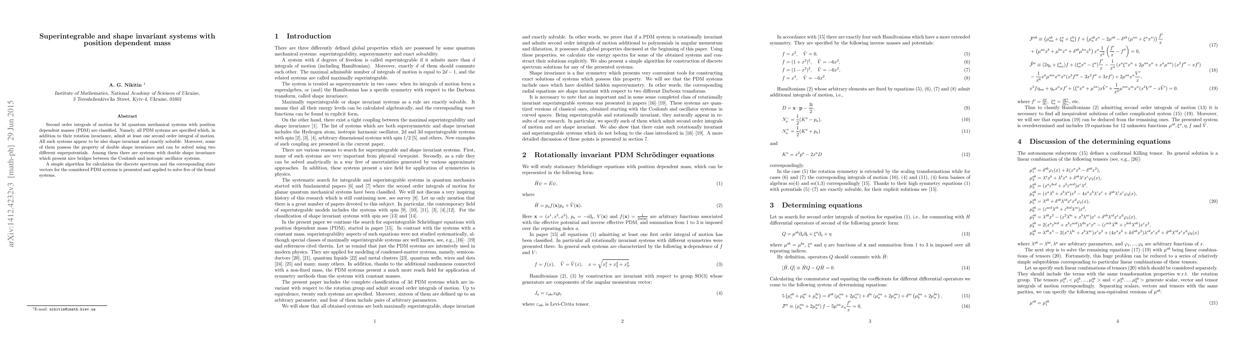 Second order integrals of motion for 3d quantum mechanical systems with position dependent masses (PDM) are classified. Namely, all PDM systems are specified which, in addition to their rotation invariance, admit at least one second order integral of motion. All such systems appear to be also shape invariant and exactly solvable. Moreover, some of them possess the property of double shape invariance and can be solved using two different superpotentials. Among them there are systems with double shape invariance which present nice bridges between the Coulomb and isotropic oscillator systems. A simple algorithm for calculation the discrete spectrum and the corresponding state vectors for the considered PDM systems is presented and applied to solve five of the found systems.