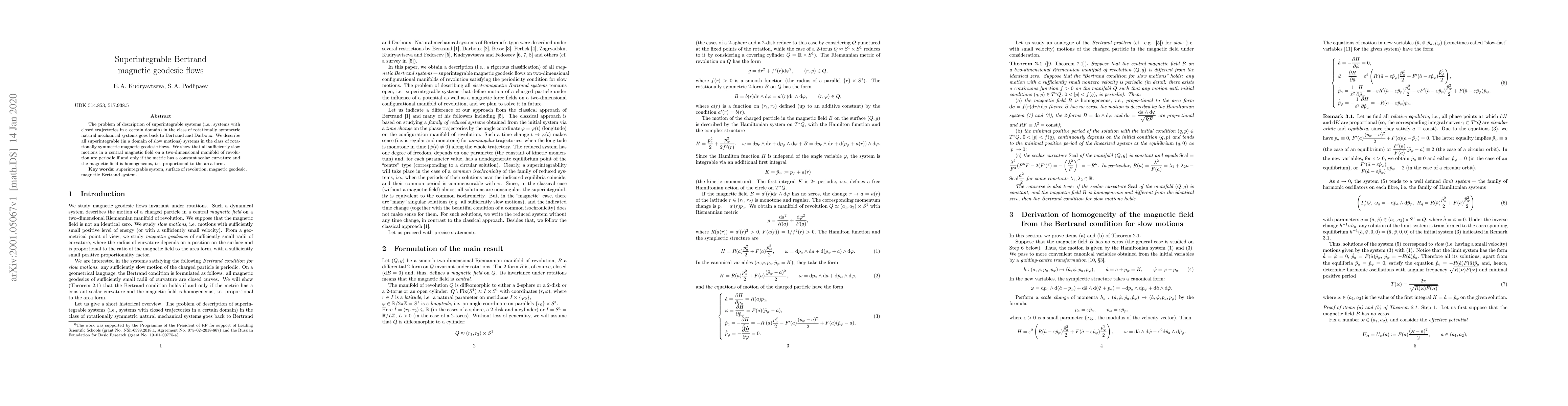 This paper identifies all superintegrable systems within rotationally symmetric magnetic geodesic flows, demonstrating that slow motions in a central magnetic field on a two-dimensional manifold of revolution are periodic when the metric has constant scalar curvature and the magnetic field is homogeneous.
