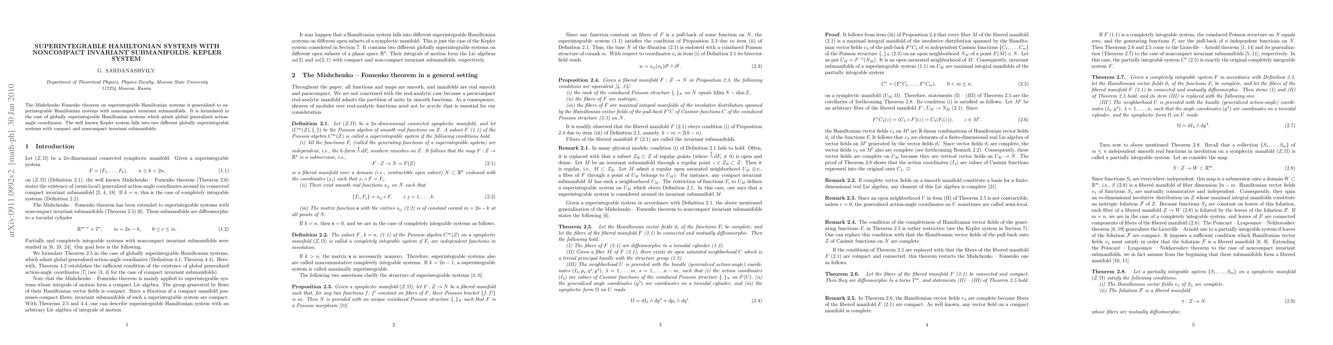 The paper generalizes the Mishchenko-Fomenko theorem for superintegrable Hamiltonian systems to include noncompact invariant submanifolds. The Kepler system is analyzed as an example, demonstrating its existence within two distinct globally superintegrable frameworks: one with compact and one with noncompact invariant submanifolds.