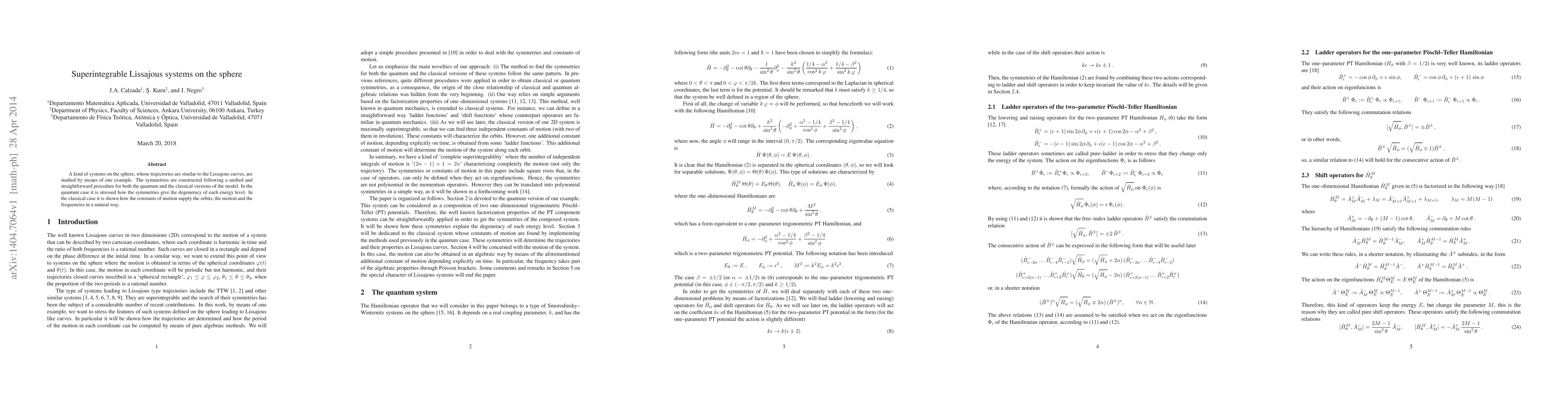 The research methodology involves studying a kind of systems on the sphere, whose trajectories resemble Lissajous curves, using a single example. Symmetries are constructed for both quantum and classical versions of the model, demonstrating how they provide degeneracy in quantum energy levels and supply orbits, motion, and frequencies in the classical case.