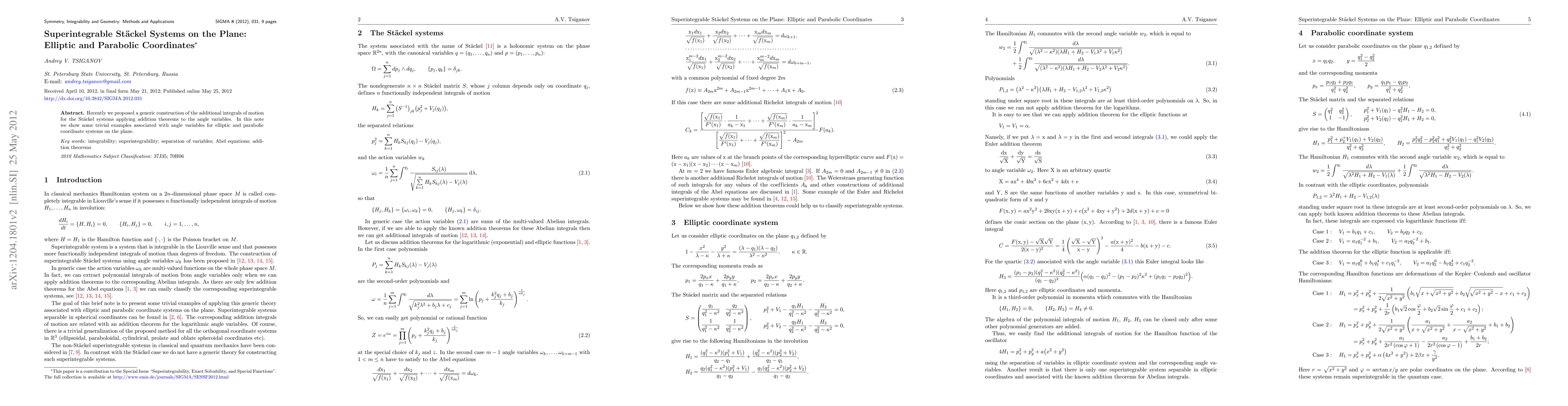 Recently we proposed a generic construction of the additional integrals of motion for the St\"ackel systems applying addition theorems to the angle variables. In this note we show some trivial examples associated with angle variables for elliptic and parabolic coordinate systems on the plane.