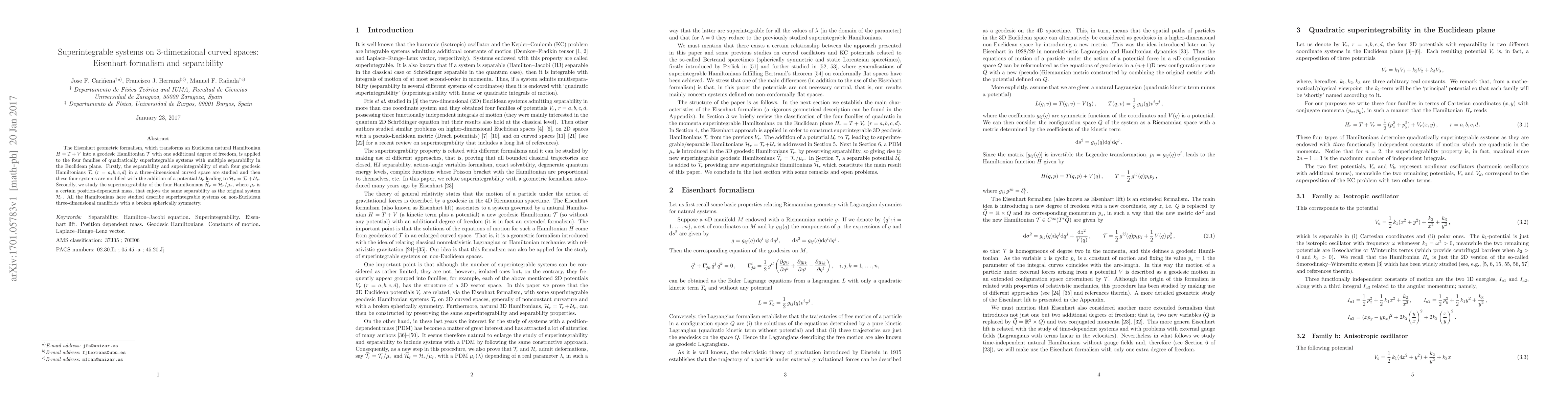 This paper applies Eisenhart's geometric formalism to study quadratically superintegrable systems on 3-dimensional curved spaces, transforming Euclidean Hamiltonians into geodesic forms. It investigates the separability and superintegrability of modified Hamiltonians with added potentials and position-dependent mass, concluding on their properties on non-Euclidean manifolds.