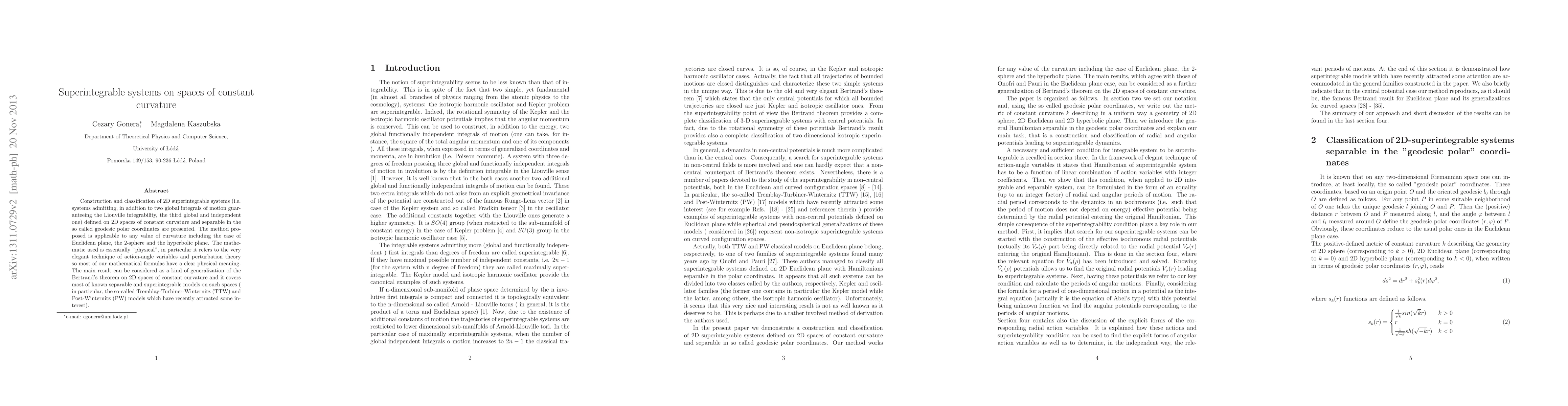 This paper presents a method for constructing and classifying 2D superintegrable systems on spaces of constant curvature, using geodesic polar coordinates and physical mathematical techniques like action-angle variables. The main result generalizes Bertrand's theorem and encompasses known separable models like the TTW and PW models.