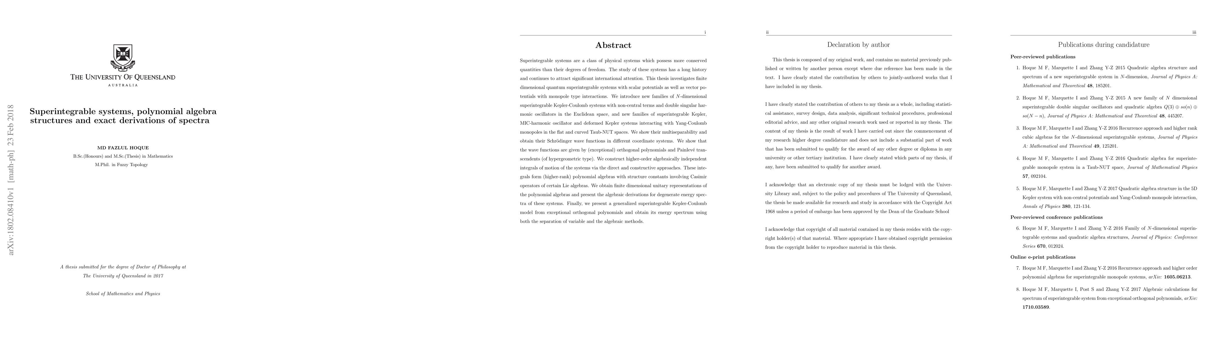 Superintegrable systems are a class of physical systems which possess more conserved quantities than their degrees of freedom. The study of these systems has a long history and continues to attract significant international attention. This thesis investigates finite dimensional quantum superintegrable systems with scalar potentials as well as vector potentials with monopole type interactions. We introduce new families of $N$-dimensional superintegrable Kepler-Coulomb systems with non-central terms and double singular harmonic oscillators in the Euclidean space, and new families of superintegrable Kepler, MIC-harmonic oscillator and deformed Kepler systems interacting with Yang-Coulomb monopoles in the flat and curved Taub-NUT spaces. We show their multiseparability and obtain their Schr\"{o}dinger wave functions in different coordinate systems. We show that the wave functions are given by (exceptional) orthogonal polynomials and Painlev\'{e} transcendents (of hypergeometric type). We construct higher-order algebraically independent integrals of motion of the systems via the direct and constructive approaches. These integrals form (higher-rank) polynomial algebras with structure constants involving Casimir operators of certain Lie algebras. We obtain finite dimensional unitary representations of the polynomial algebras and present the algebraic derivations for degenerate energy spectra of these systems. Finally, we present a generalized superintegrable Kepler-Coulomb model from exceptional orthogonal polynomials and obtain its energy spectrum using both the separation of variable and the algebraic methods.