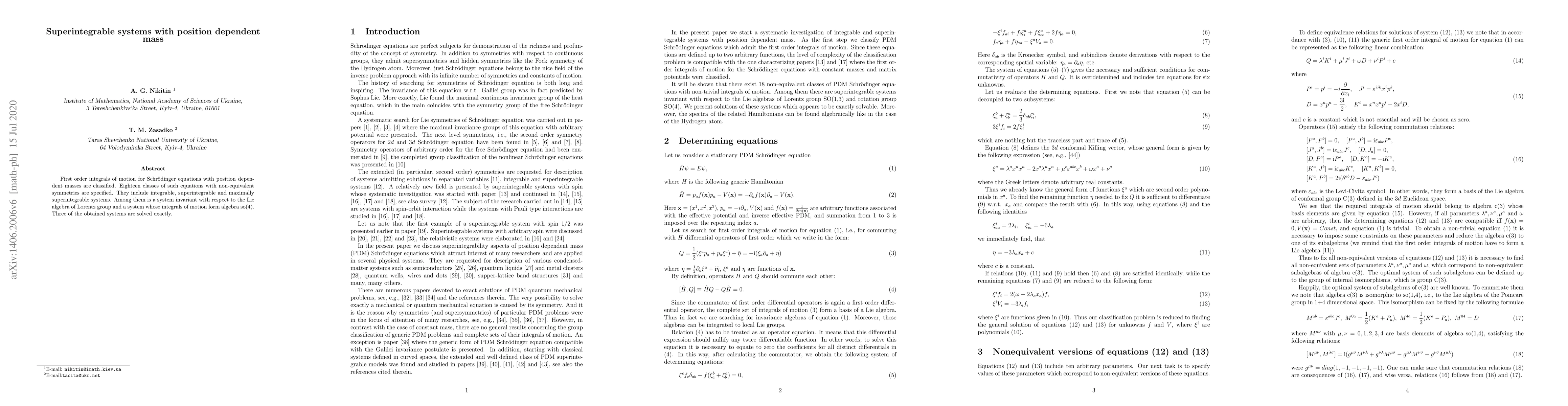 This paper classifies first-order integrals of motion for Schrödinger equations with position-dependent masses, identifying seventeen non-equivalent symmetry classes including integrable, superintegrable, and maximally superintegrable systems, with three systems solved exactly.