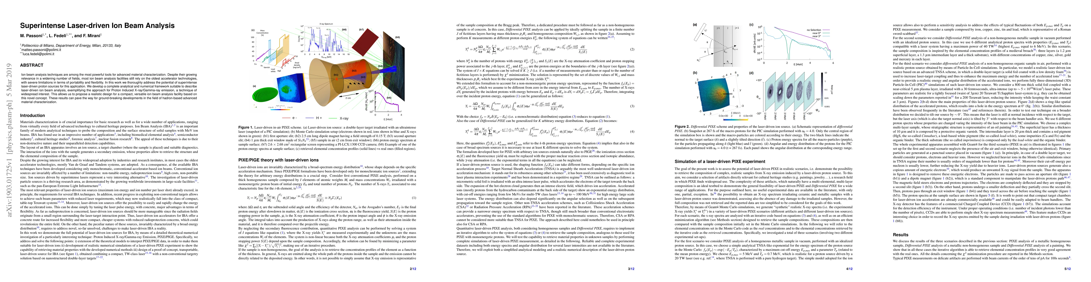 This paper explores the potential of superintense laser-driven proton sources for advanced material characterization, proposing a compact, versatile ion beam analysis facility. The study develops a comprehensive analytical and numerical framework to describe laser-driven ion beam analysis, specifically for Proton Induced X-ray/Gamma-ray emission, and suggests significant advancements in hadron-based material characterization.