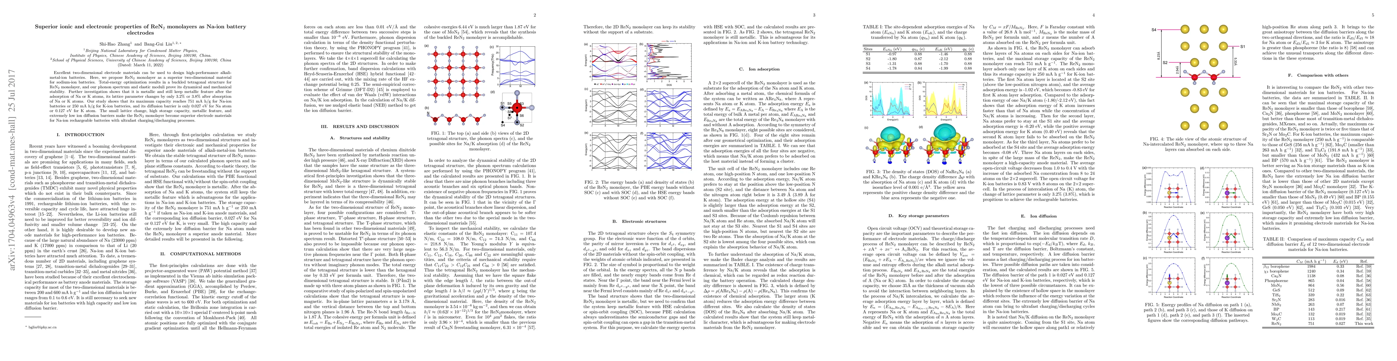 ReN$_2$ monolayers exhibit superior ionic and electronic properties, making them ideal for sodium-ion battery electrodes due to their high storage capacity, minimal lattice change upon ion absorption, and low ion diffusion barriers. Their metallic nature and mechanical stability further enhance their performance in fast charging/discharging processes.