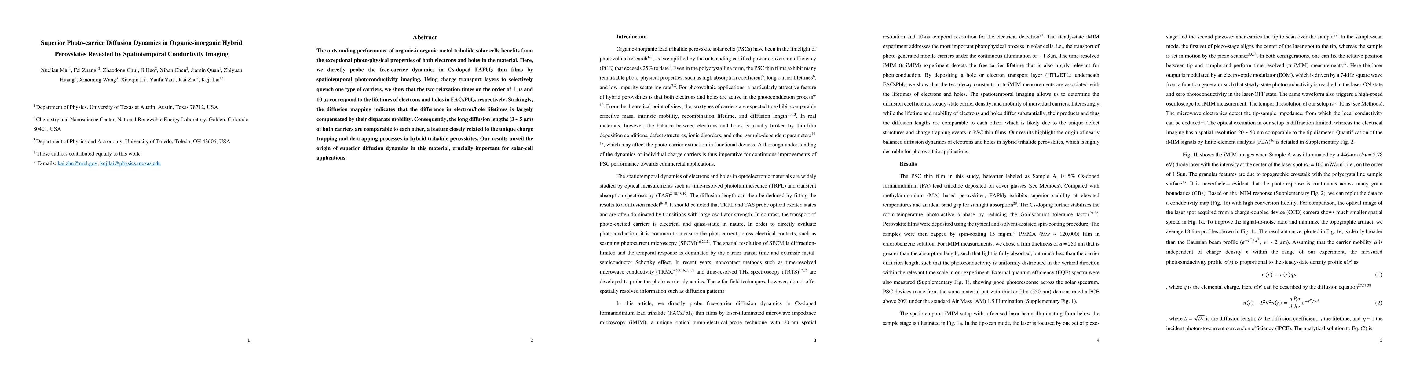 The outstanding performance of organic-inorganic metal trihalide solar cells benefits from the exceptional photo-physical properties of both electrons and holes in the material. Here, we directly probe the free-carrier dynamics in Cs-doped FAPbI3 thin films by spatiotemporal photoconductivity imaging. Using charge transport layers to selectively quench one type of carriers, we show that the two relaxation times on the order of 1 microsecond and 10 microseconds correspond to the lifetimes of electrons and holes in FACsPbI3, respectively. Strikingly, the diffusion mapping indicates that the difference in electron/hole lifetimes is largely compensated by their disparate mobility. Consequently, the long diffusion lengths (3 ~ 5 micrometers) of both carriers are comparable to each other, a feature closely related to the unique charge trapping and de-trapping processes in hybrid trihalide perovskites. Our results unveil the origin of superior diffusion dynamics in this material, crucially important for solar-cell applications.