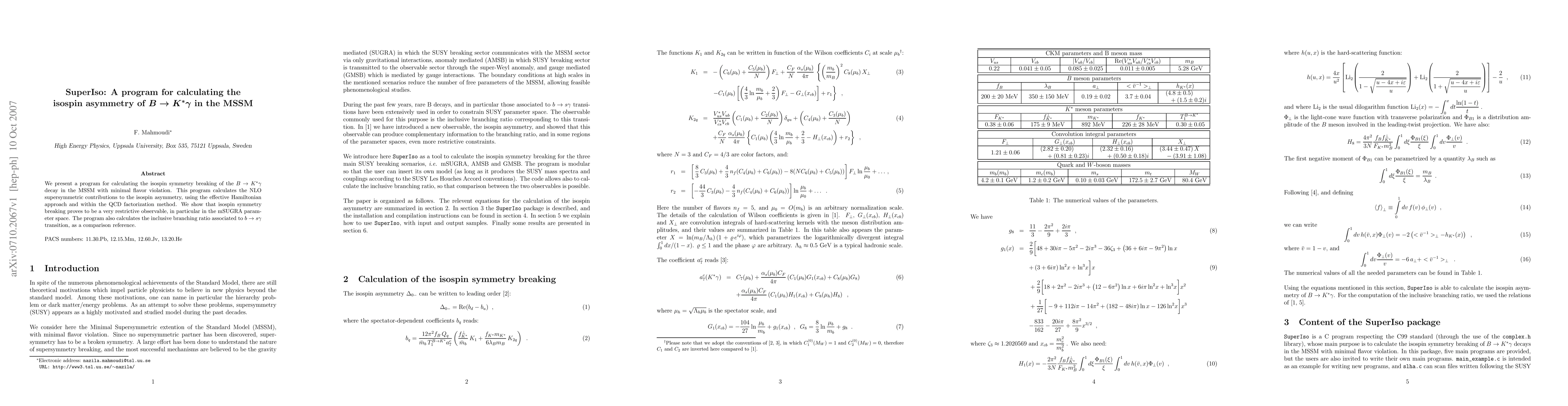 We present a program for calculating the isospin symmetry breaking of the B -> K* gamma decay in the MSSM with minimal flavor violation. This program calculates the NLO supersymmetric contributions to the isospin asymmetry, using the effective Hamiltonian approach and within the QCD factorization method. We show that isospin symmetry breaking proves to be a very restrictive observable, in particular in the mSUGRA parameter space. The program also calculates the inclusive branching ratio associated to b -> s gamma transition, as a comparison reference.