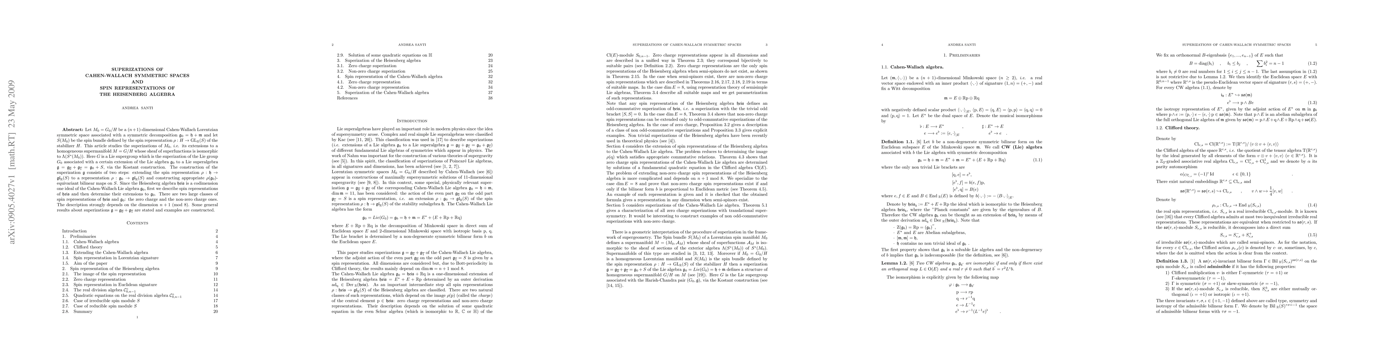 This paper investigates the superizations of Cahen-Wallach Lorentzian symmetric spaces, extending them to homogeneous supermanifolds, and explores the spin representations of the Heisenberg algebra within this context. It constructs the superizations by extending spin representations and determining their equivariant bilinear maps, focusing on the classification of spin representations based on charge and dimension.