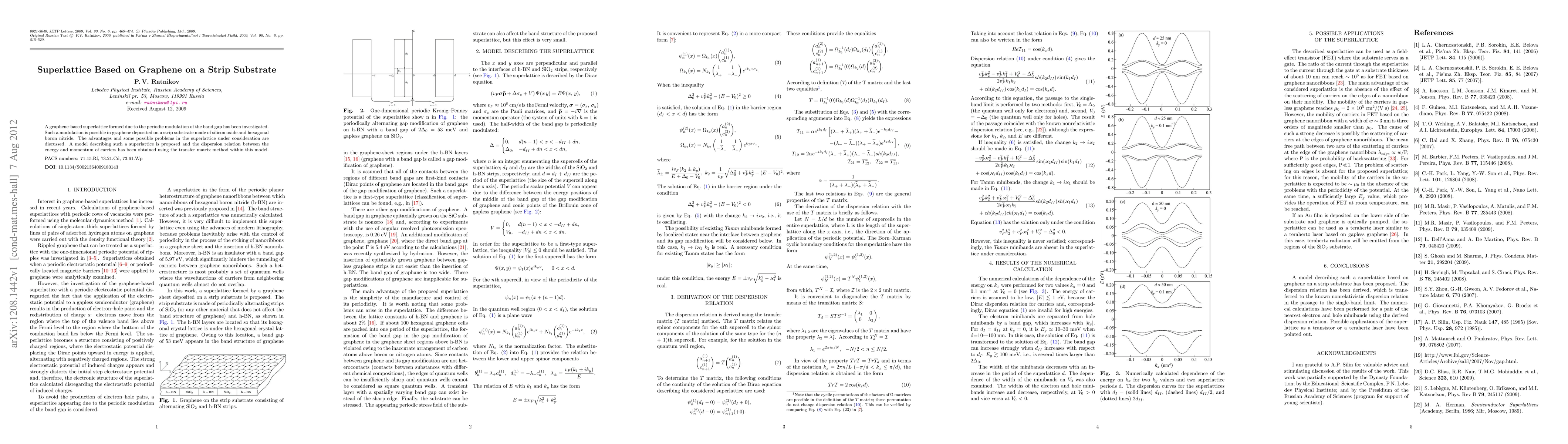 This paper investigates a graphene-based superlattice formed on a strip substrate of silicon oxide and hexagonal boron nitride, exploring its band gap modulation and proposing a model to describe it. The study also derives the dispersion relation for carriers using the transfer matrix method.