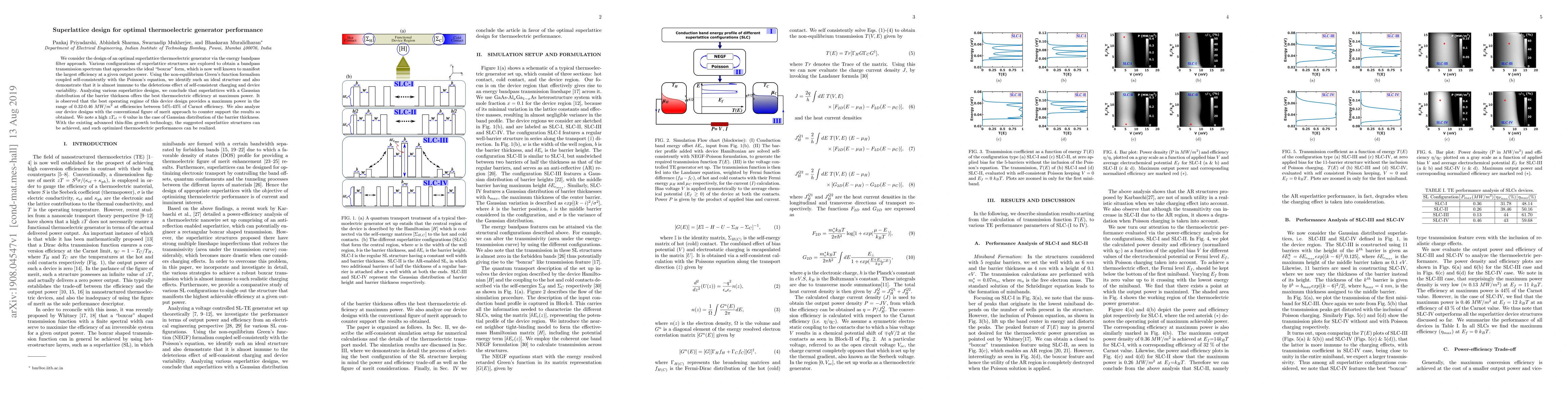 We consider the design of an optimal superlattice thermoelectric generator via the energy bandpass filter approach. Various configurations of superlattice structures are explored to obtain a bandpass transmission spectrum that approaches the ideal ``boxcar'' form, which is now well known to manifest the largest efficiency at a given output power. Using the non-equilibrium Green's function formalism coupled self-consistently with the Poisson's equation, we identify such an ideal structure and also demonstrate that it is almost immune to the deleterious effect of self-consistent charging and device variability. Analyzing various superlattice designs, we conclude that superlattices with a Gaussian distribution of the barrier thickness offers the best thermoelectric efficiency at maximum power. It is observed that the best operating regime of this device design provides a maximum power in the range of 0.32-0.46 $MW/m^2$ at efficiencies between 54\%-43\% of Carnot efficiency. We also analyze our device designs with the conventional figure of merit approach to counter support the results so obtained. We note a high $zT_{el}=6$ value in the case of Gaussian distribution of the barrier thickness. With the existing advanced thin-film growth technology, the suggested superlattice structures can be achieved, and such optimized thermoelectric performances can be realized.
