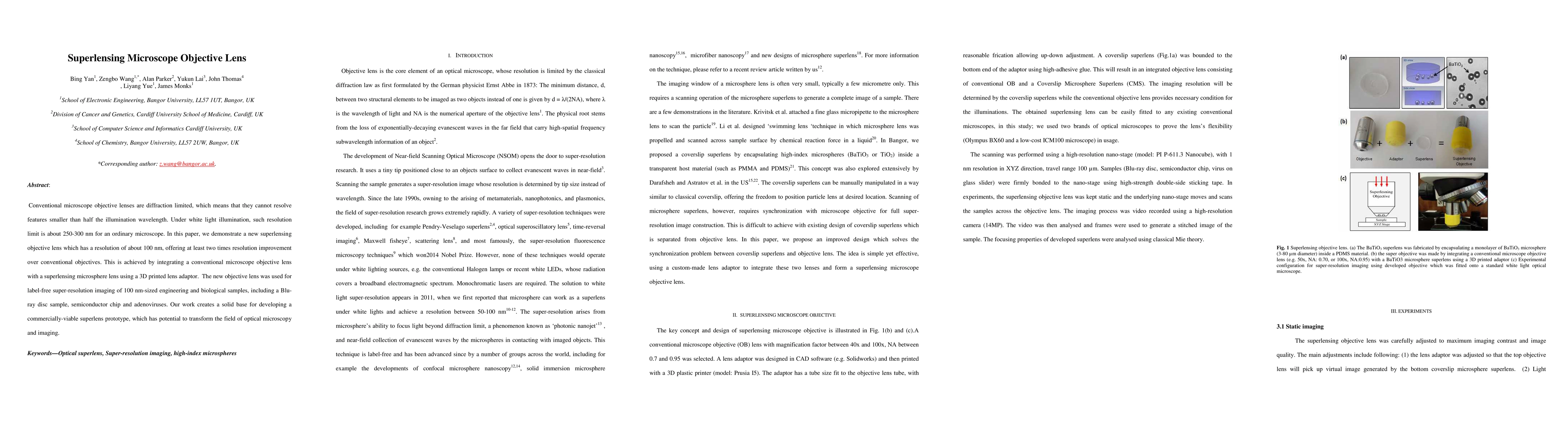 This paper introduces a superlensing microscope objective lens that significantly improves resolution to about 100 nm, doubling the conventional limit of 250-300 nm, by integrating a superlensing microsphere with a conventional lens and demonstrates its application in imaging various nanoscale samples.