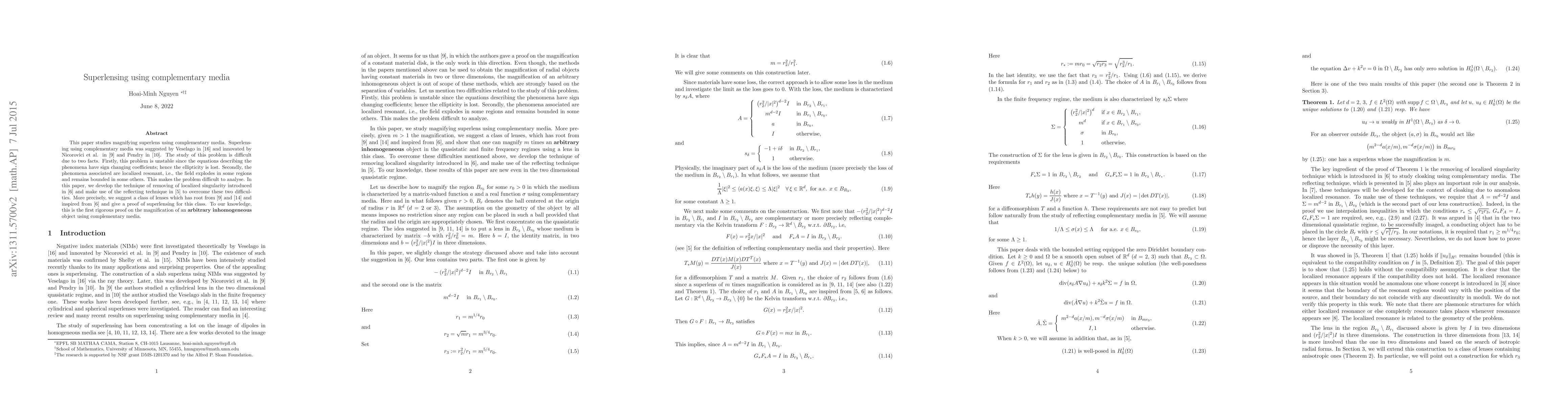 This paper proposes a class of superlenses utilizing complementary media to overcome instability and localized singularity issues, providing the first rigorous proof for magnifying inhomogeneous objects using such media. The approach combines prior techniques to handle the inherent difficulties in superlensing.