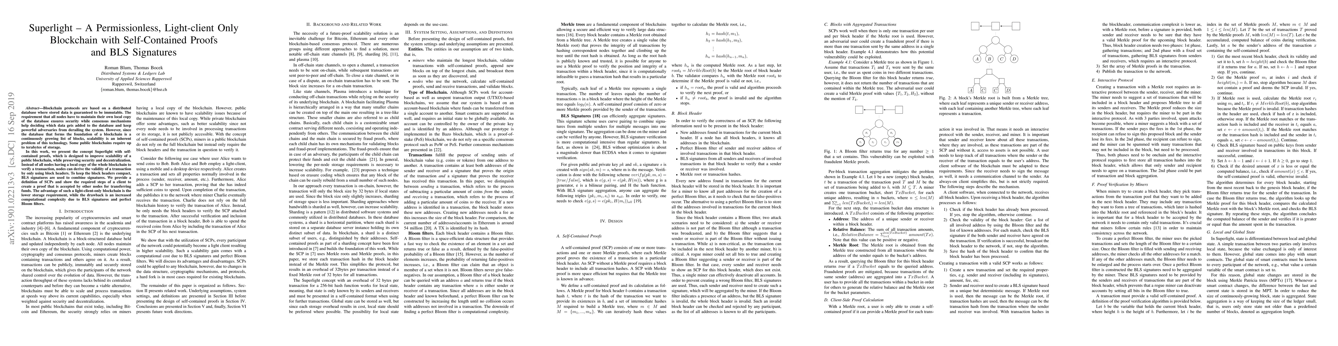 Superlight is a permissionless blockchain designed for scalability by employing light-clients that verify transactions using only block headers, thus reducing storage needs. It utilizes BLS signatures for compact block headers and self-contained proofs to maintain security and decentralization.