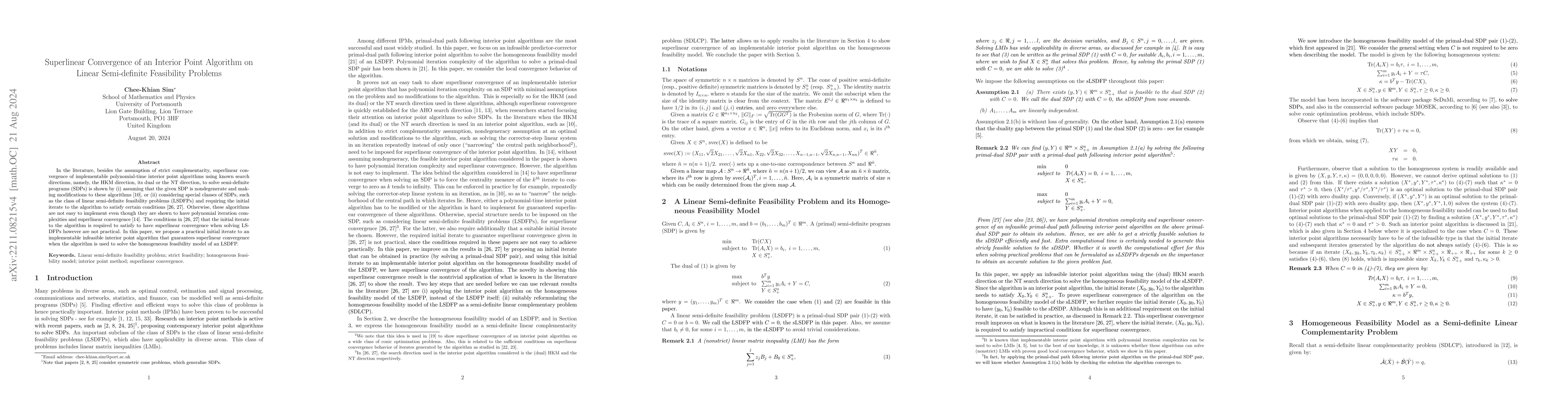 In the literature, besides the assumption of strict complementarity, superlinear convergence of implementable polynomial-time interior point algorithms using known search directions, namely, the HKM direction, its dual or the NT direction, to solve semi-definite programs (SDPs) is shown by (i) assuming that the given SDP is nondegenerate and making modifications to these algorithms [10], or (ii) considering special classes of SDPs, such as the class of linear semi-definite feasibility problems (LSDFPs) and requiring the initial iterate to the algorithm to satisfy certain conditions [26, 27]. Otherwise, these algorithms are not easy to implement even though they are shown to have polynomial iteration complexities and superlinear convergence [14]. The conditions in [26, 27] that the initial iterate to the algorithm is required to satisfy to have superlinear convergence when solving LSDFPs however are not practical. In this paper, we propose a practical initial iterate to an implementable infeasible interior point algorithm that guarantees superlinear convergence when the algorithm is used to solve the homogeneous feasibility model of an LSDFP.