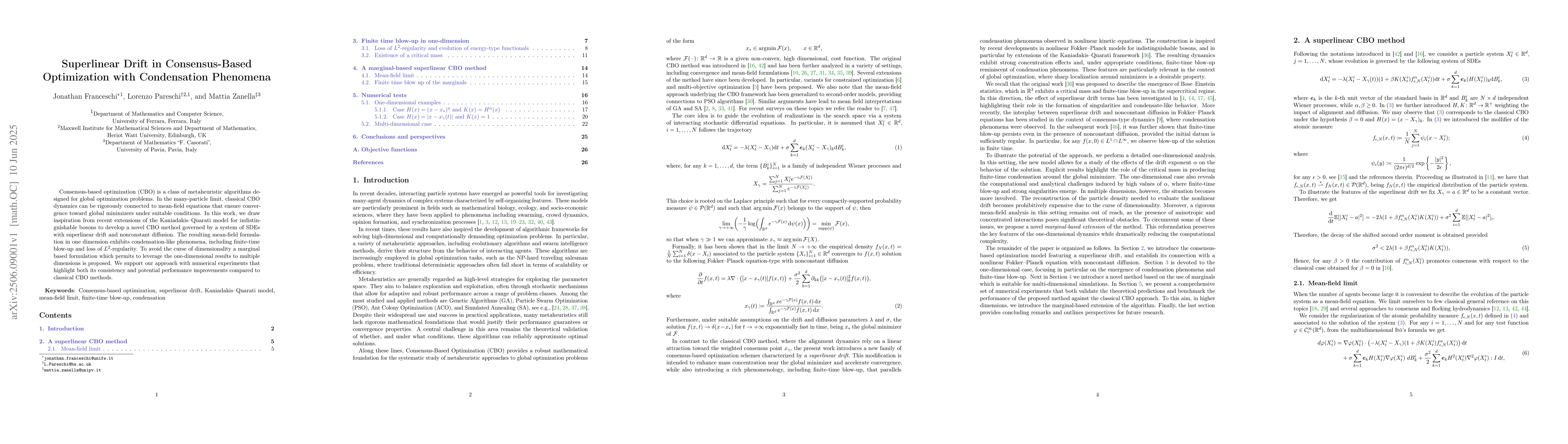 Consensus-based optimization (CBO) is a class of metaheuristic algorithms designed for global optimization problems. In the many-particle limit, classical CBO dynamics can be rigorously connected to mean-field equations that ensure convergence toward global minimizers under suitable conditions. In this work, we draw inspiration from recent extensions of the Kaniadakis--Quarati model for indistinguishable bosons to develop a novel CBO method governed by a system of SDEs with superlinear drift and nonconstant diffusion. The resulting mean-field formulation in one dimension exhibits condensation-like phenomena, including finite-time blow-up and loss of $L^2$-regularity. To avoid the curse of dimensionality a marginal based formulation which permits to leverage the one-dimensional results to multiple dimensions is proposed. We support our approach with numerical experiments that highlight both its consistency and potential performance improvements compared to classical CBO methods.