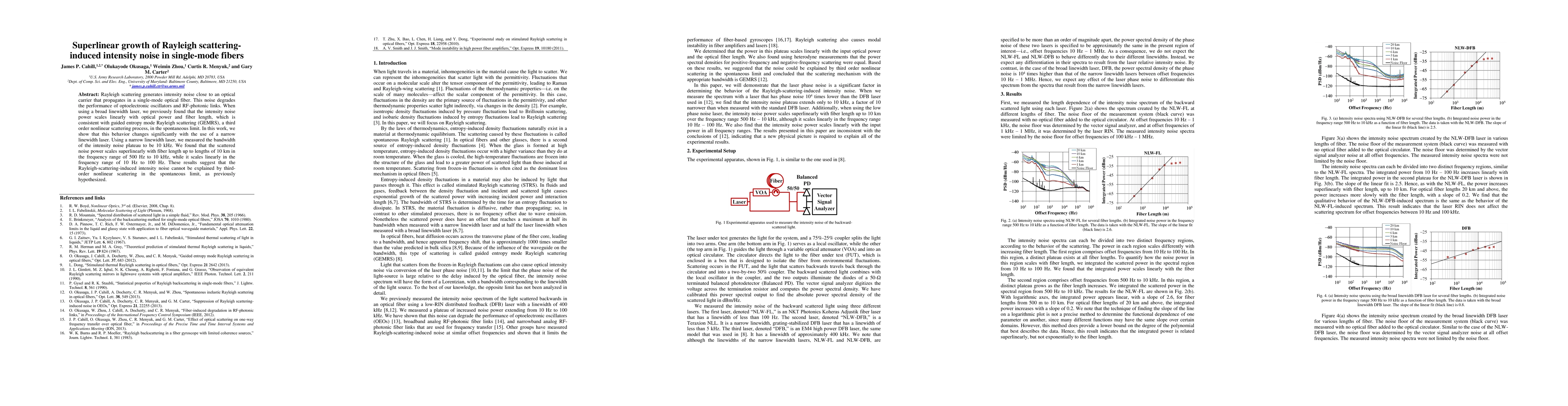 Rayleigh scattering generates intensity noise close to an optical carrier that propagates in a single-mode optical fiber. This noise degrades the performance of optoelectronic oscillators and RF-photonic links. When using a broad linewidth laser, we previously found that the intensity noise power scales linearly with optical power and fiber length, which is consistent with guided entropy mode Rayleigh scattering (GEMRS), a third order nonlinear scattering process, in the spontaneous limit. In this work, we show that this behavior changes significantly with the use of a narrow linewidth laser. Using a narrow linewidth laser, we measured the bandwidth of the intensity noise plateau to be 10 kHz. We found that the scattered noise power scales superlinearly with fiber length up to lengths of 10 km in the frequency range of 500 Hz to 10 kHz, while it scales linearly in the frequency range of 10 Hz to 100 Hz. These results suggest that the Rayleigh-scattering-induced intensity noise cannot be explained by third-order nonlinear scattering in the spontaneous limit, as previously hypothesized.