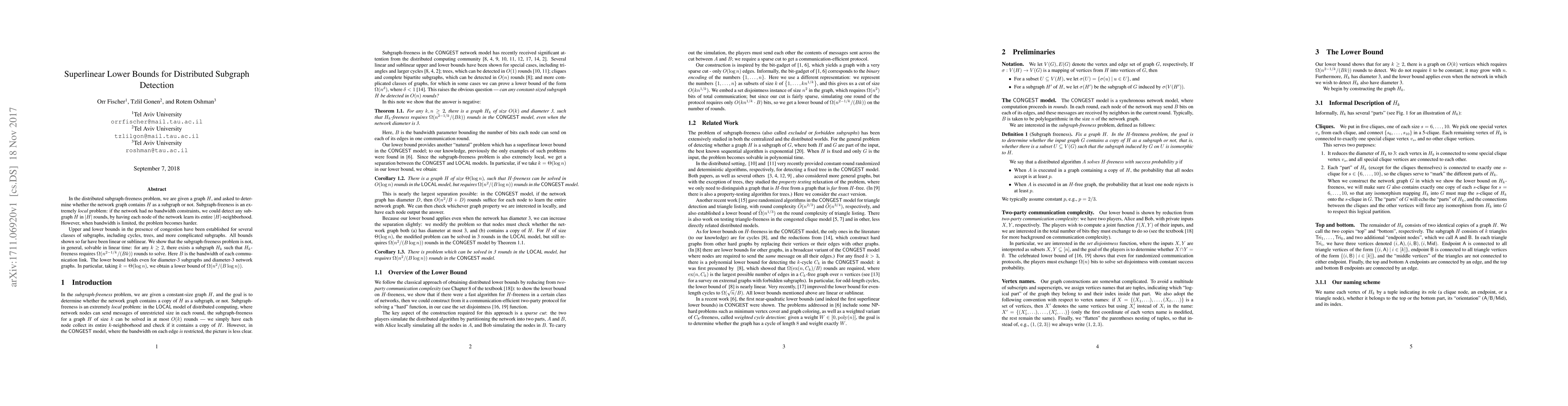 This paper establishes superlinear lower bounds for the distributed subgraph-freeness problem, demonstrating that certain subgraphs cannot be detected in linear time under bandwidth constraints. Specifically, for any $k \geq 2$, it shows that detecting $H_k$ subgraphs requires $\Omega( n^{2-1/k} / (Bk) )$ rounds, highlighting the complexity of the problem when bandwidth is limited.