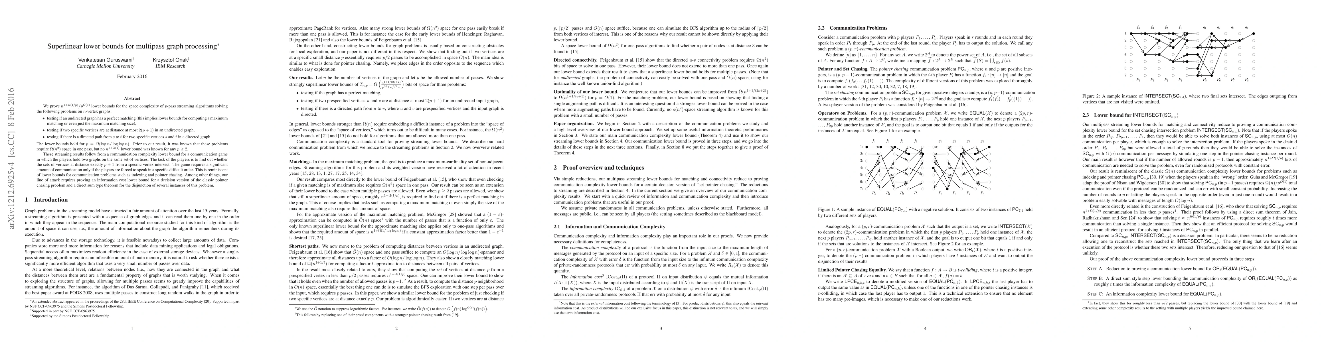 We prove $n^{1+\Omega(1/p)}/p^{O(1)}$ lower bounds for the space complexity of $p$-pass streaming algorithms solving the following problems on $n$-vertex graphs: * testing if an undirected graph has a perfect matching (this implies lower bounds for computing a maximum matching or even just the maximum matching size), * testing if two specific vertices are at distance at most $2(p+1)$ in an undirected graph, * testing if there is a directed path from $s$ to $t$ for two specific vertices $s$ and $t$ in a directed graph. Prior to our result, it was known that these problems require $\Omega(n^2)$ space in one pass, but no $n^{1+\Omega(1)}$ lower bound was known for any $p\ge 2$. These streaming results follow from a communication complexity lower bound for a communication game in which the players hold two graphs on the same set of vertices. The task of the players is to find out whether the sets of vertices at distance exactly $p+1$ from a specific vertex intersect. The game requires a significant amount of communication only if the players are forced to speak in a specific difficult order. This is reminiscent of lower bounds for communication problems such as indexing and pointer chasing. Among other things, our line of attack requires proving an information cost lower bound for a decision version of the classic pointer chasing problem and a direct sum type theorem for the disjunction of several instances of this problem.
